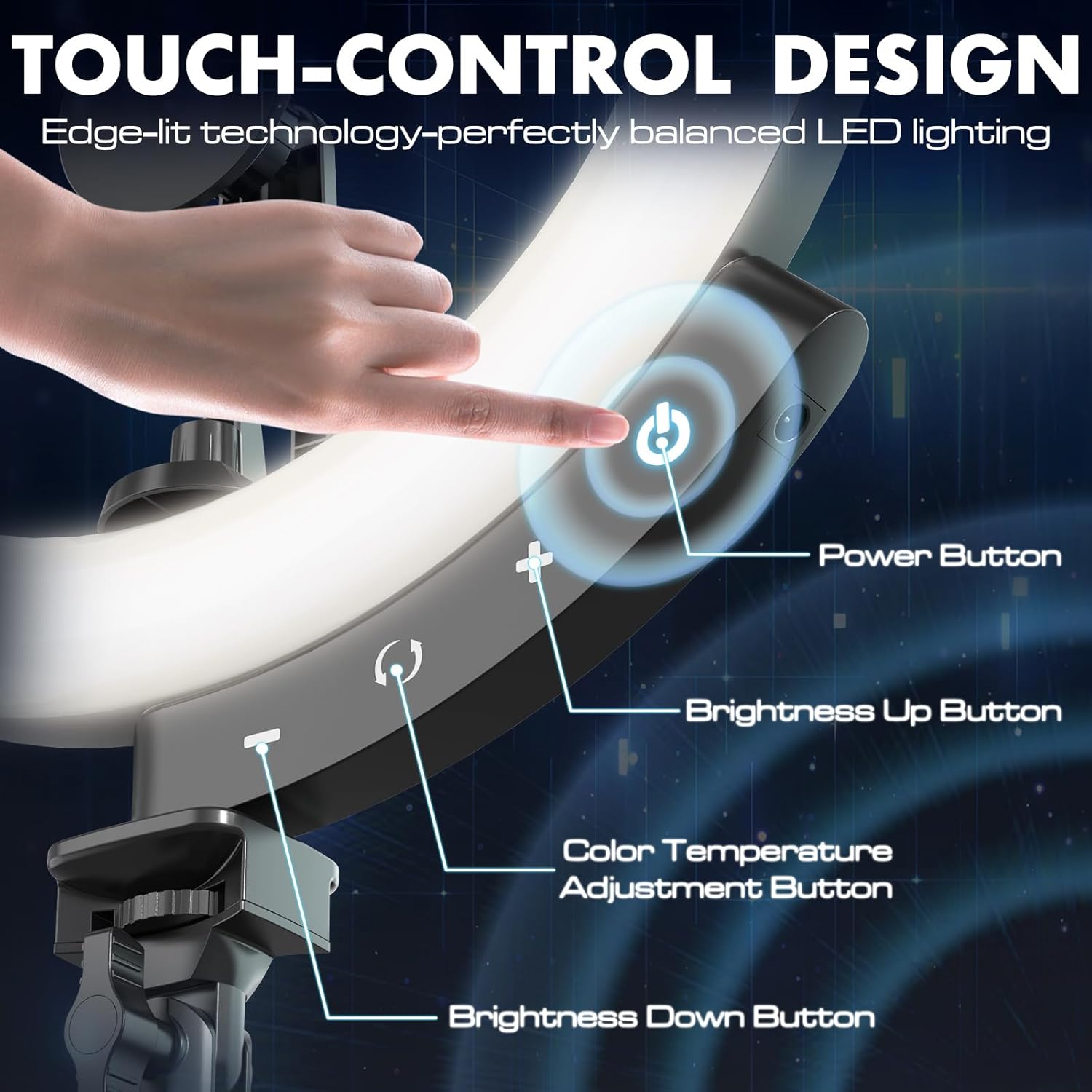 - 【Touch-Control Design】Our ring light features advanced touch-sensitive design, incorporating touch-sensitive power and adjustment keys, encompassing 5 levels of color temperature and 10 levels of brightness adjustment. Full control of your preferred light temperature and brightness in 10% increments to help you find the perfect light.