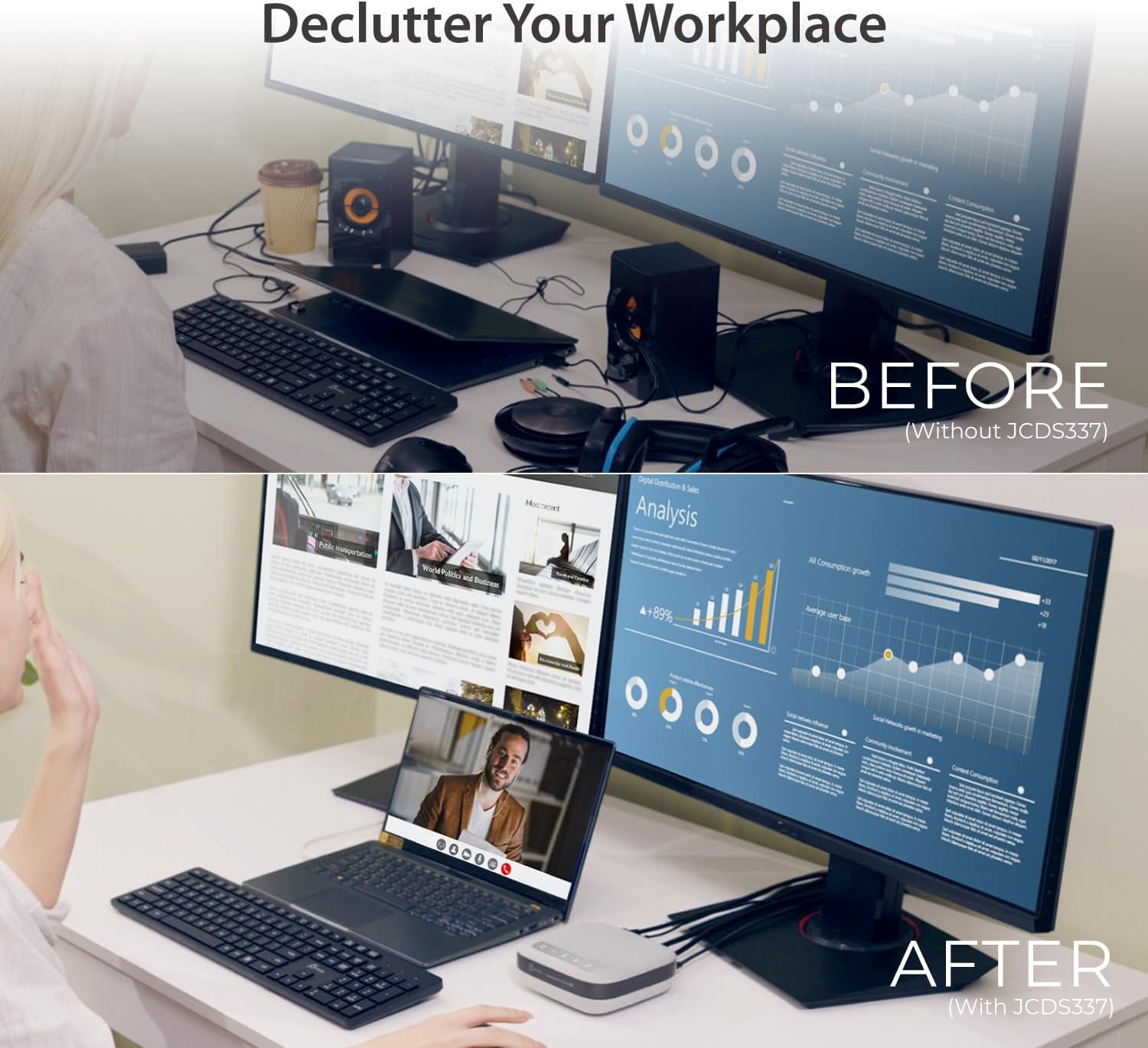 - 【Elevate Your Workspace】: Transform your laptop into a comprehensive workstation and conferencing hub with the JCDS337. This all-in-one docking station packs a punch with two 4K HDMI outputs, 2 x USB-A 10Gbps, 1 x USB-C 10Gbps, gigabit ethernet, PD pass-through charing and a built-in business-grade speakerphone. Say goodbye to cable clutter and hello to productivity.