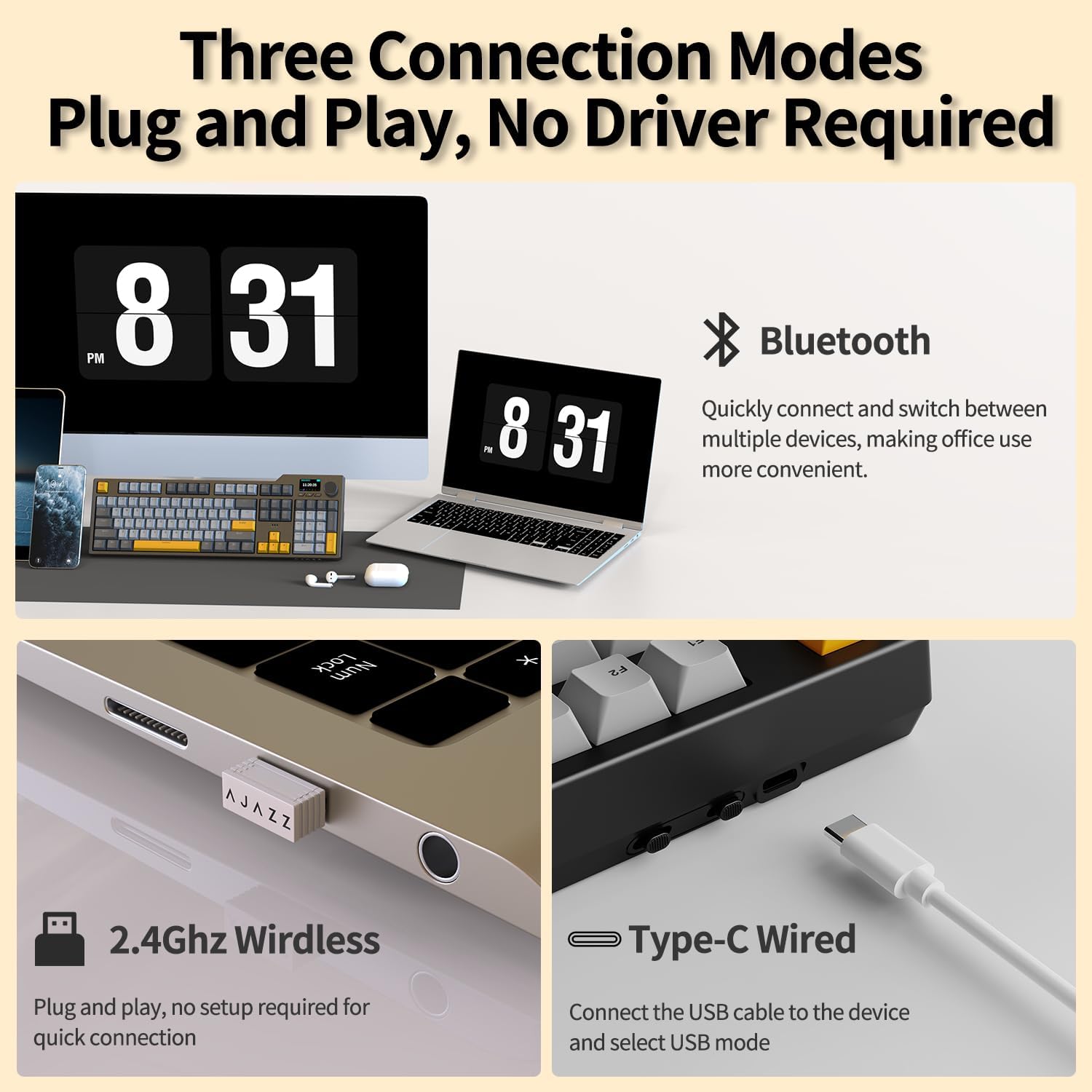 - 【Other Well-Designed Features】①Oil-resistant PBT keycap OEM profile to prevent long-term dirt accumulation; ②Factory pre-lubricated linear switches, providing fast typing and quick response, quieter and smoother, suitable for gaming and typing; ③Anti-ghosting, All keys are non-conflict NKRO (N-Key Rollover); ④Two-level adjustable stand provides you with a more comfortable typing angle.