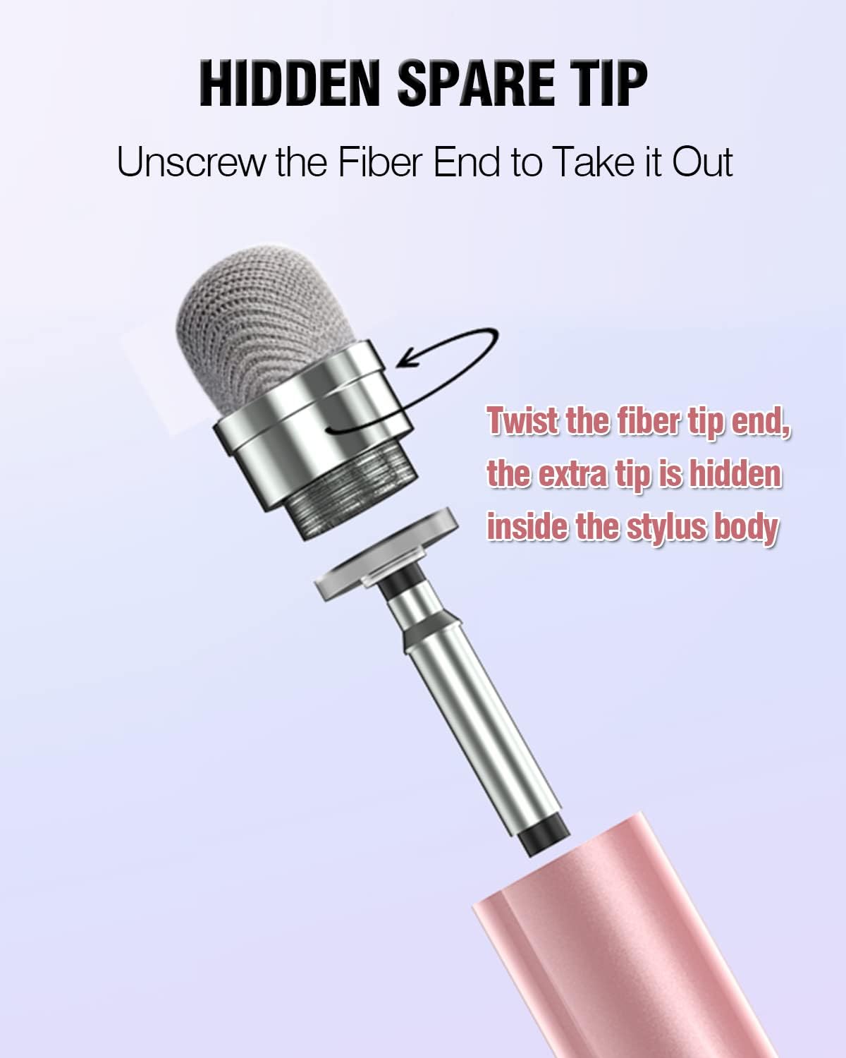 - 【HIDDEN SPARE TIP】This 3 Pack Styluses come with 3 additional disc tips and 3 extra fiber tips. Each disc tip is placed inside the stylus body. The spare tip can be taken out by simply rotating the fiber tip end. Convenient for you to always keep a spare pen tip ready to go.