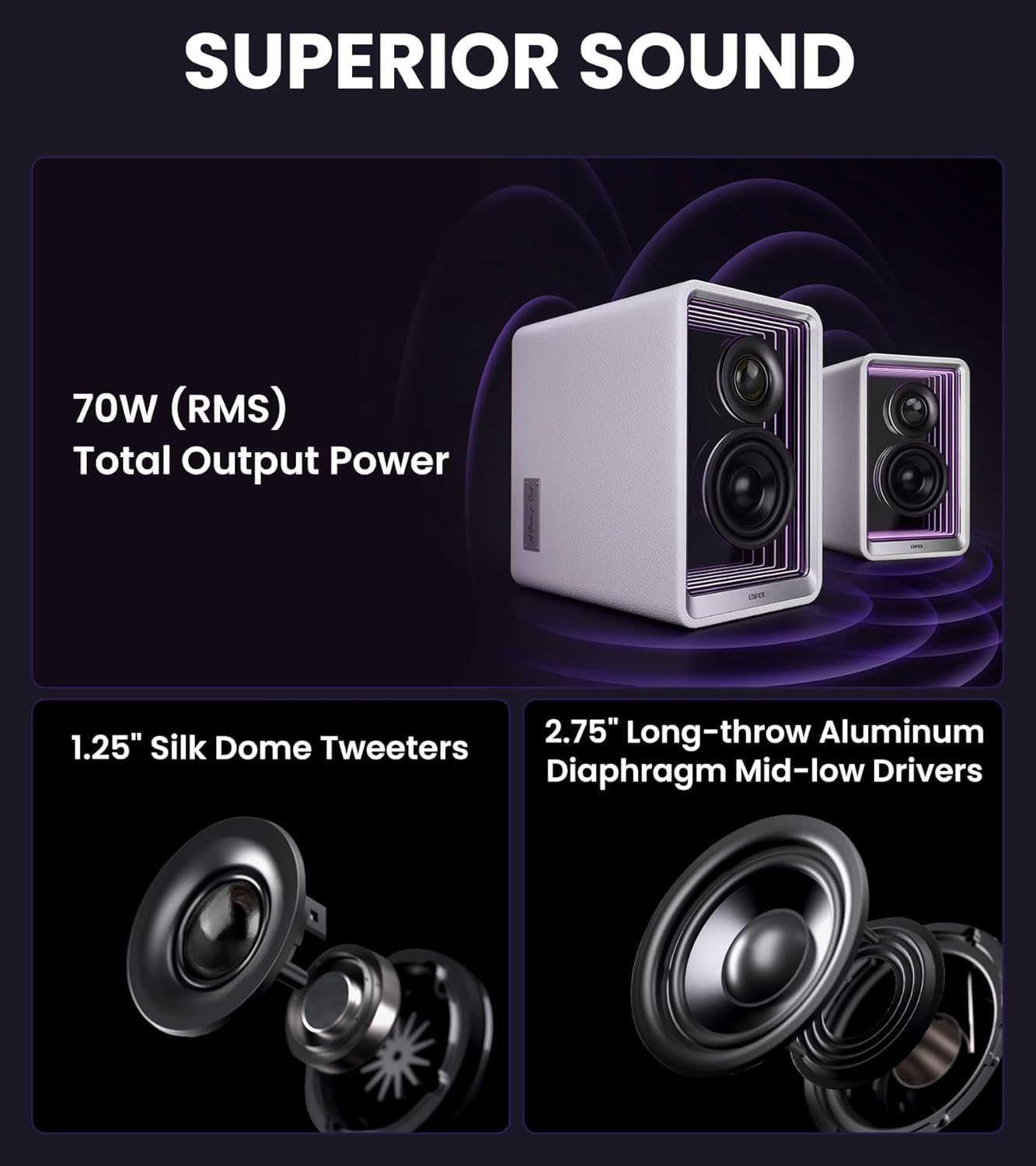 - [Superior Sound] 70W (RMS) total output power with Class-D Tl amplifier chips, featuring 1.25" (32mm) silk dome tweeters with neodymium magnets and 2.75" (70mm) long-throw aluminum diaphragm mid-low drivers. The well-designed acoustic architecture for a premium sound experience.