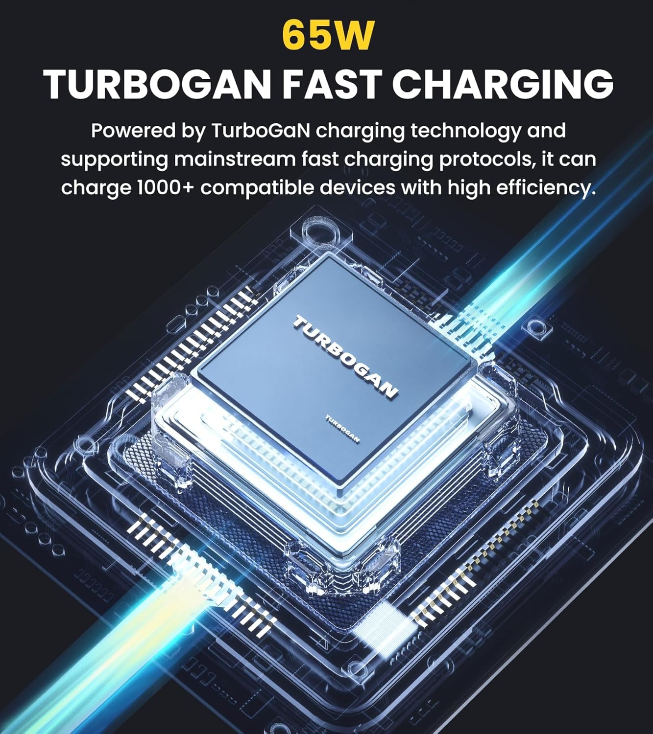- [65W TurboGan Fast Charging] Each USB Type-C port provides a maximum power capacity of 65W for charging. Powered by TurboGaN charging technology and supporting mainstream fast charging protocols, it can charge 1000+ compatible devices with high efficiency.