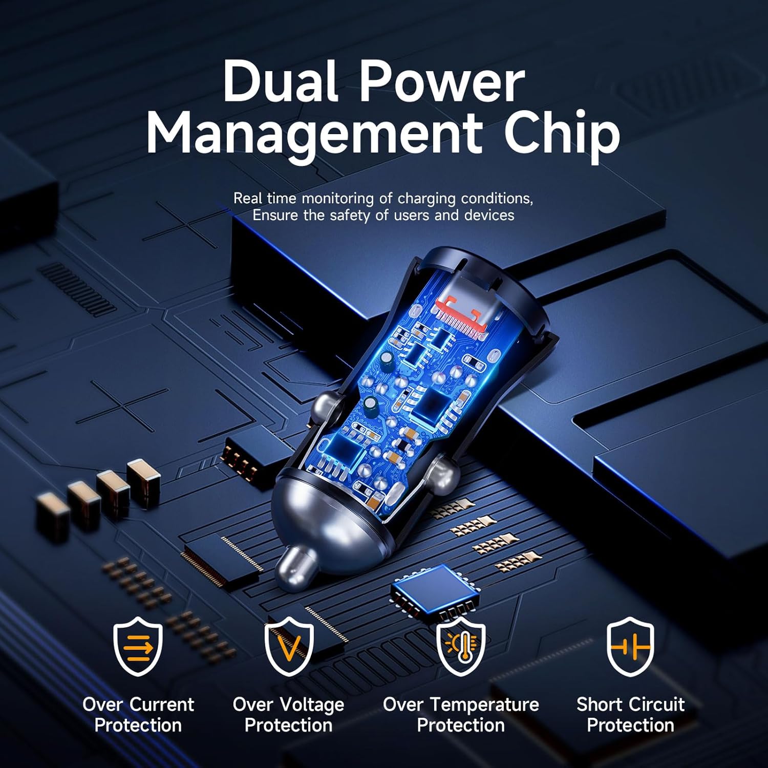 - ăSophisticated and Ultra-Compact Aluminum DesignăEngineered for space-saving without sacrificing power, this car phone charger features a robust aluminum alloy construction. It's designed to blend seamlessly with any vehicle's interior, offering a touch of elegance. Additionally, it efficiently dissipates heat generated during charging to ensure top charging speed and efficiency.