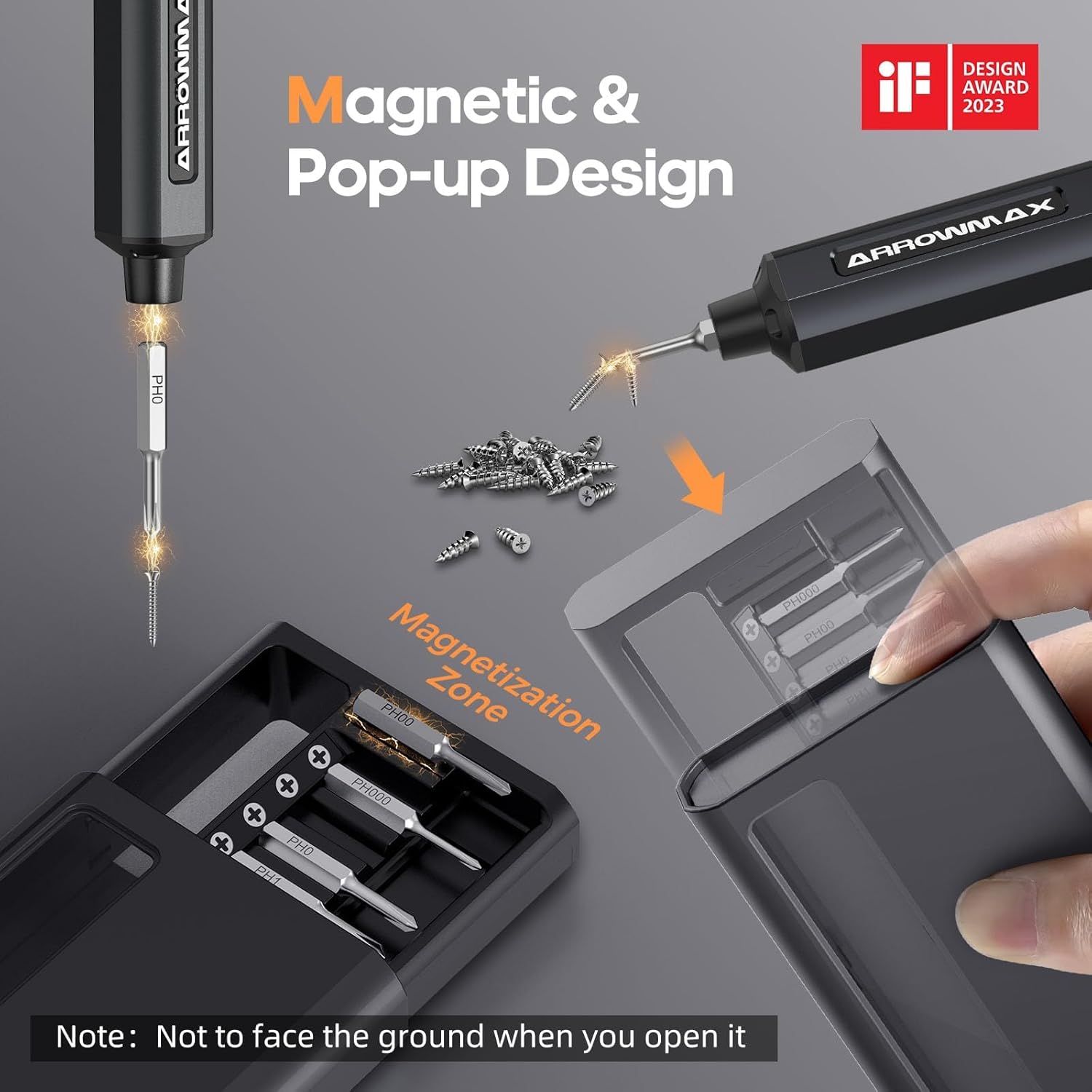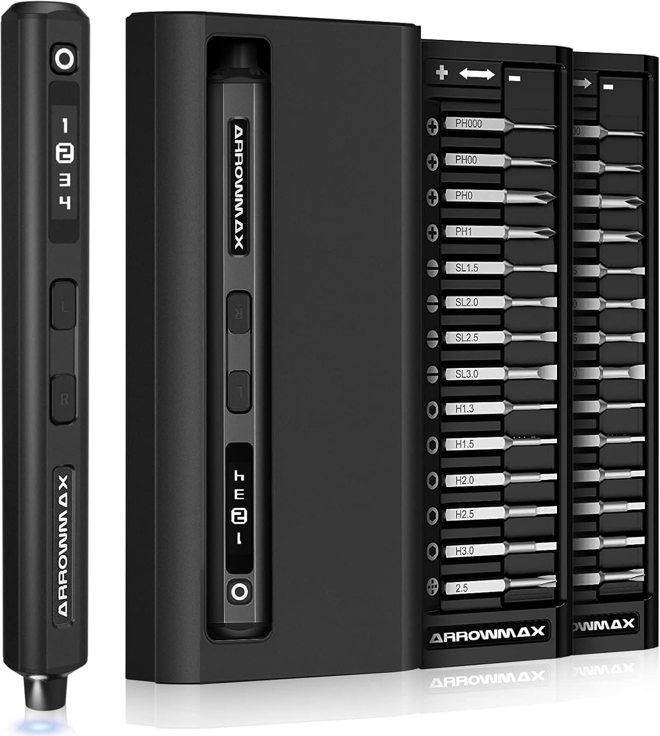 AM ARROWMAX Electric Screwdriver, Precision Screwdriver w/ 34 Magnetic Bits, 4 Torque Settings, Red Dot, IF Winning Design, Rechargeable Mini Repair Tool Kit for Phone, Laptop, Camera (SES) Black