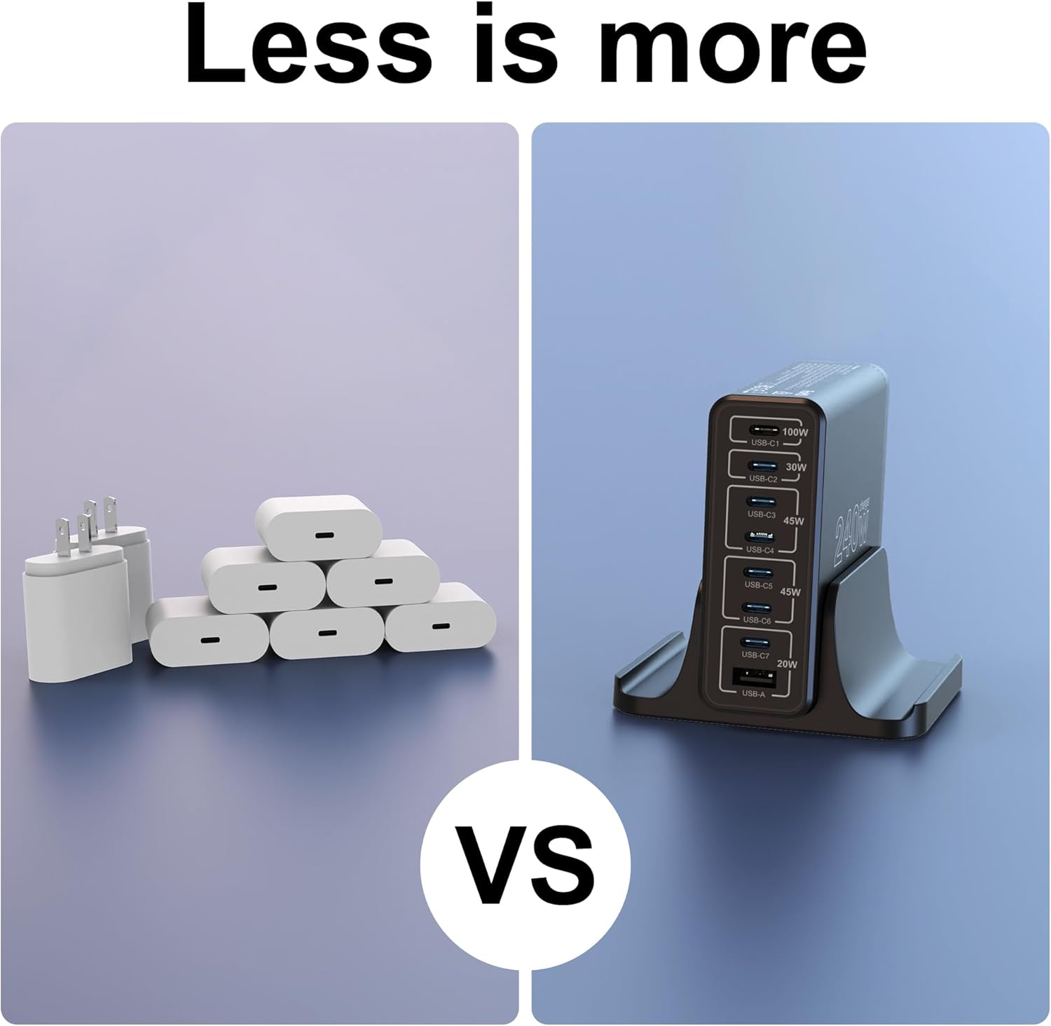 - 240W Strong Power: With USB-C1 port providing up to 100W, USB-C2 provide 30W, USB-C3 and USB-C4 or USB-C5 and USB-C6 share 45W, USB-C7 and USB-A share 20W, this multiport USB C charging station charge up to 8 devices simultaneously with a maximum output of 240 Watts