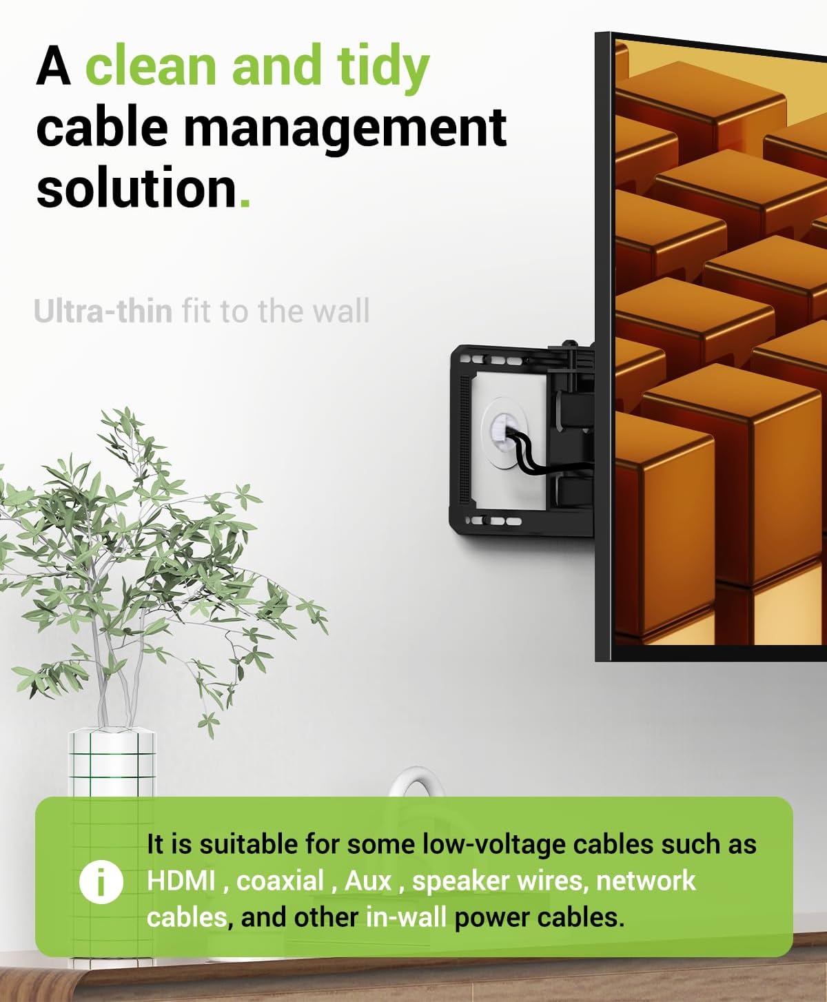 - NEAT AND BEAUTIFUL WALL: This behind-wall TV wire kit features a white glossy brush plate that maintains a tidy appearance and resists fading. Its thin thickness and color blend perfectly with any wall, giving it a fresh, professional look.