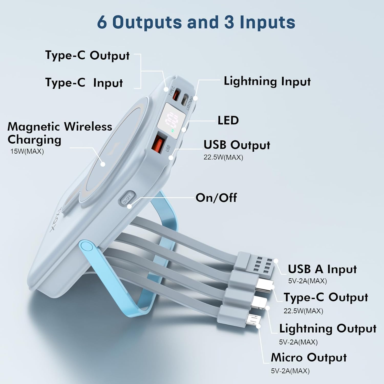 - ใ10000mAh Magnetic Power Bank with built-in cablesใPortable charger with built in 3 charging cables and 1 recharging cable, USB-C cable, for iPhone cable and Micro cable for output use, you can use these three cables direct charging your different smart devices, also built-in USB-A cable for recharging, perfect battery bank for travel, no need to carry any extra cords.(๐๐ฅ๐๐๐ฌ๐ ๐ง๐จ๐ญ๐:๐๐ก๐๐ง ๐ฒ๐จ๐ฎ ๐ฐ๐๐ง๐ญ ๐ญ๐จ ๐ฎ๐ฌ๐ ๐ญ๐ก๐ ๐ฐ๐ข๐ซ๐๐ฅ๐๐ฌ๐ฌ ๐๐ก๐๐ซ๐ ๐ข๐ง๐ ๐๐ฎ๐ง๐๐ญ๐ข๐จ๐ง, ๐ฉ๐ฅ๐๐๐ฌ๐ ๐ฉ๐ฅ๐๐๐ ๐ฒ๐จ๐ฎ๐ซ ๐๐๐ฏ๐ข๐๐๐ฌ ๐ข๐ง ๐ญ๐ก๐ ๐ฆ๐๐ ๐ง๐๐ญ๐ข๐ ๐ฉ๐จ๐ฌ๐ข๐ญ๐ข๐จ๐ง,๐ญ๐ก๐๐ง ๐ญ๐ฎ๐ซ๐ง ๐จ๐ง ๐ญ๐ก๐ ๐ฉ๐จ๐ฐ๐๐ซ ๐ฌ๐ฐ๐ข๐ญ๐๐ก ๐จ๐ง ๐ญ๐ก๐ ๐ฌ๐ข๐๐ ๐จ๐ ๐ญ๐ก๐ ๐ฉ๐จ๐ฐ๐๐ซ ๐๐๐ง๐ค)