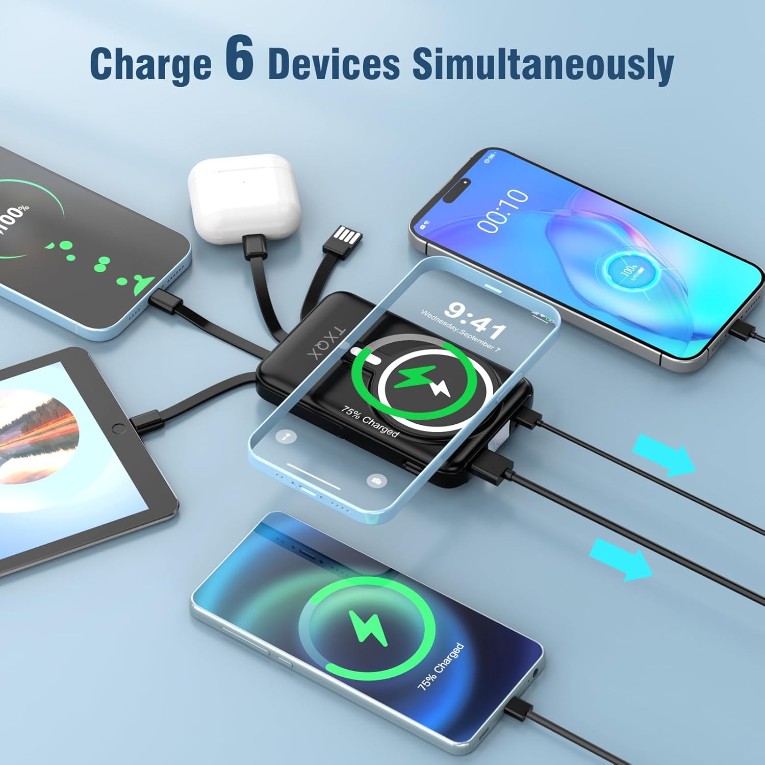 - ใ10000mAh Magnetic Power Bank with built-in cablesใMagnetic Portable charger with built in 3 charging cables and 1 recharging cable, USB-C cable, for iPhone cable and Micro cable for output use, you can use these three cables direct charging your different smart devices, also built-in USB-A cable for recharging, perfect battery bank for travel, no need to carry any extra cords.(๐๐ฅ๐๐๐ฌ๐ ๐ง๐จ๐ญ๐:๐๐ก๐๐ง ๐ฒ๐จ๐ฎ ๐ฐ๐๐ง๐ญ ๐ญ๐จ ๐ฎ๐ฌ๐ ๐ญ๐ก๐ ๐ฐ๐ข๐ซ๐๐ฅ๐๐ฌ๐ฌ ๐๐ก๐๐ซ๐ ๐ข๐ง๐ ๐๐ฎ๐ง๐๐ญ๐ข๐จ๐ง, ๐ฉ๐ฅ๐๐๐ฌ๐ ๐ฉ๐ฅ๐๐๐ ๐ฒ๐จ๐ฎ๐ซ ๐๐๐ฏ๐ข๐๐๐ฌ ๐ข๐ง ๐ญ๐ก๐ ๐ฆ๐๐ ๐ง๐๐ญ๐ข๐ ๐ฉ๐จ๐ฌ๐ข๐ญ๐ข๐จ๐ง,๐ญ๐ก๐๐ง ๐ญ๐ฎ๐ซ๐ง ๐จ๐ง ๐ญ๐ก๐ ๐ฉ๐จ๐ฐ๐๐ซ ๐ฌ๐ฐ๐ข๐ญ๐๐ก ๐จ๐ง ๐ญ๐ก๐ ๐ฌ๐ข๐๐ ๐จ๐ ๐ญ๐ก๐ ๐ฉ๐จ๐ฐ๐๐ซ ๐๐๐ง๐ค)