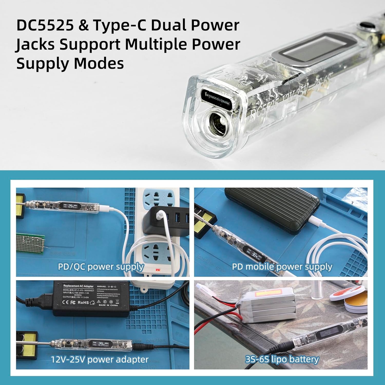 - 【Dual Power Input】 SI012 portable soldering kit features a Type-C & DC5525 power jack, supports DC+PD power input. The voltage range is extended to 12V-25V. Accepting more power supplies like 3S-6S lipo battery, PD charger, power adapter, etc.