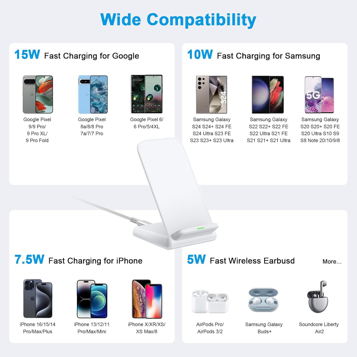 - 【4 Upgraded Charging Modes】: A high-efficiency chip provides 15W fast charge for Google Pixel 10/10 Pro/10 Pro XL/10 Pro Fold/9a/9/9 Pro XL/9 Pro/9 Pro Fold/8a/8/8 Pro/7a/7 Pro/7/6/6 Pro, 10W fast charge for Samsung Galaxy S24/S23/S22/S21/S20/S10/S9/S8/Note 20, 7.5W fast charge for iPhone 16 Pro Max/15/14/13/12/11/Pro/Max/SE/XR/XS/8, and 5W standard charge for any other wireless charging enabled devices. (Note: Fast Charging need to work with QC 3.0 adapter, the package not include the adapter.)
