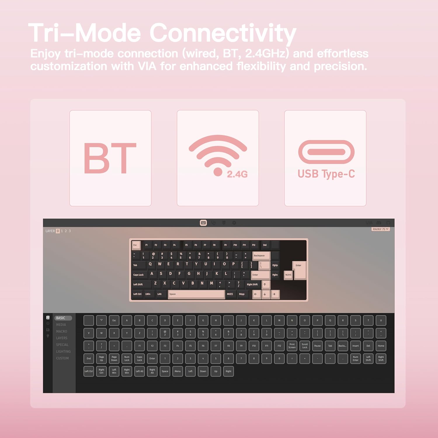 KEEBMONKEY WOBKEY Rainy 75 CNC Aluminum HMX/JWK/Cocoa Switches Triple-Mode Connectivity Mechanical Keyboard with Superior Acoustics, RGB/PP/Mirrored Glass/3500mAh/Violet Switch (Standard - Pink)