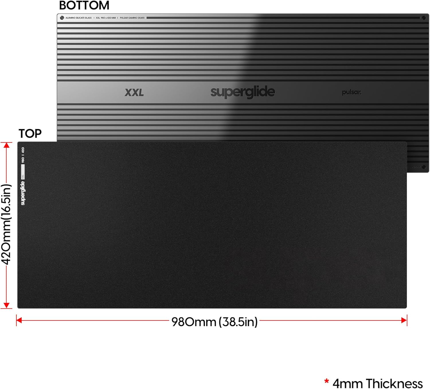 - Dimension : XXL 38.5" x 16.5" x 0.16" | 4mm Aluminosilicate glass (Gorilla Glass) with high-density silicone bottom