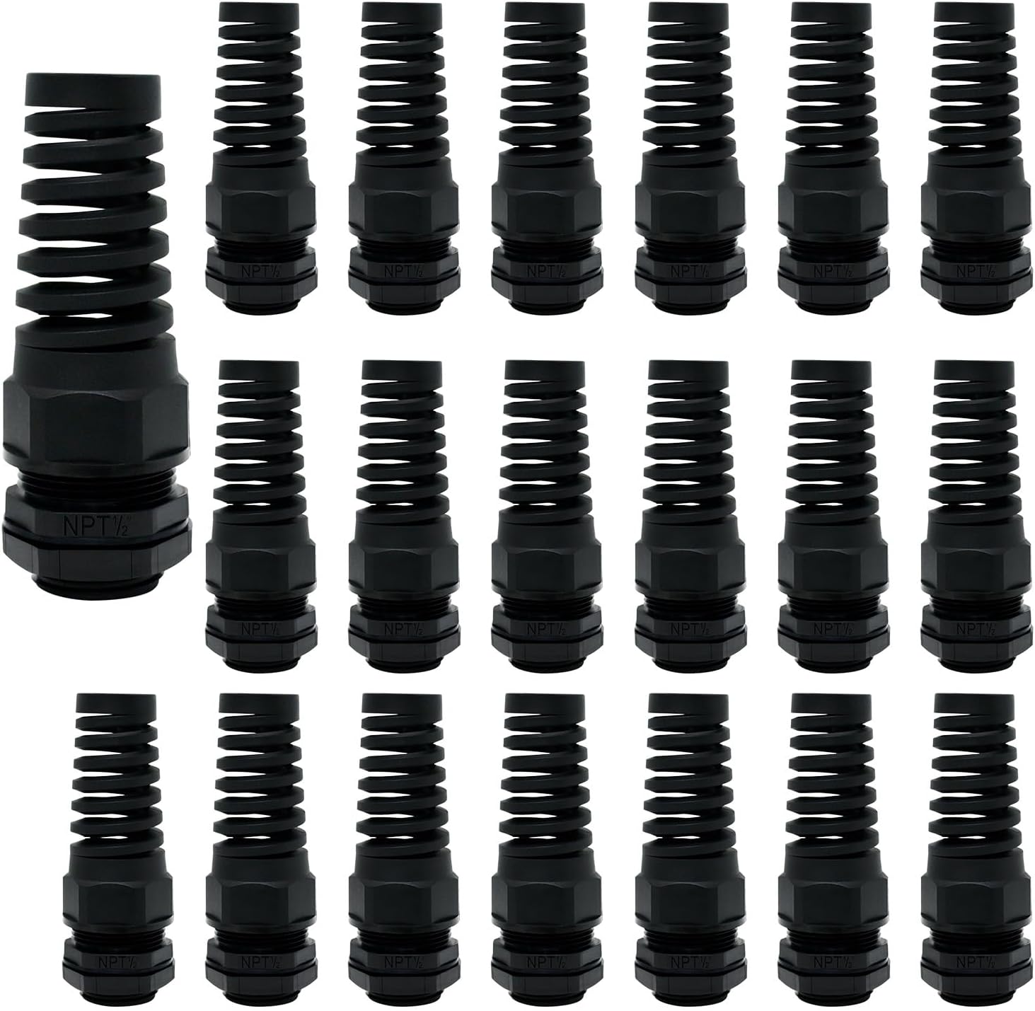 LeMotech 20Pcs NPT 1/2" IP68 Waterproof Cable Gland Flex Spiral Strain Relief Black Nylon Joint with Gaskets for 6-12mm Wire Thread