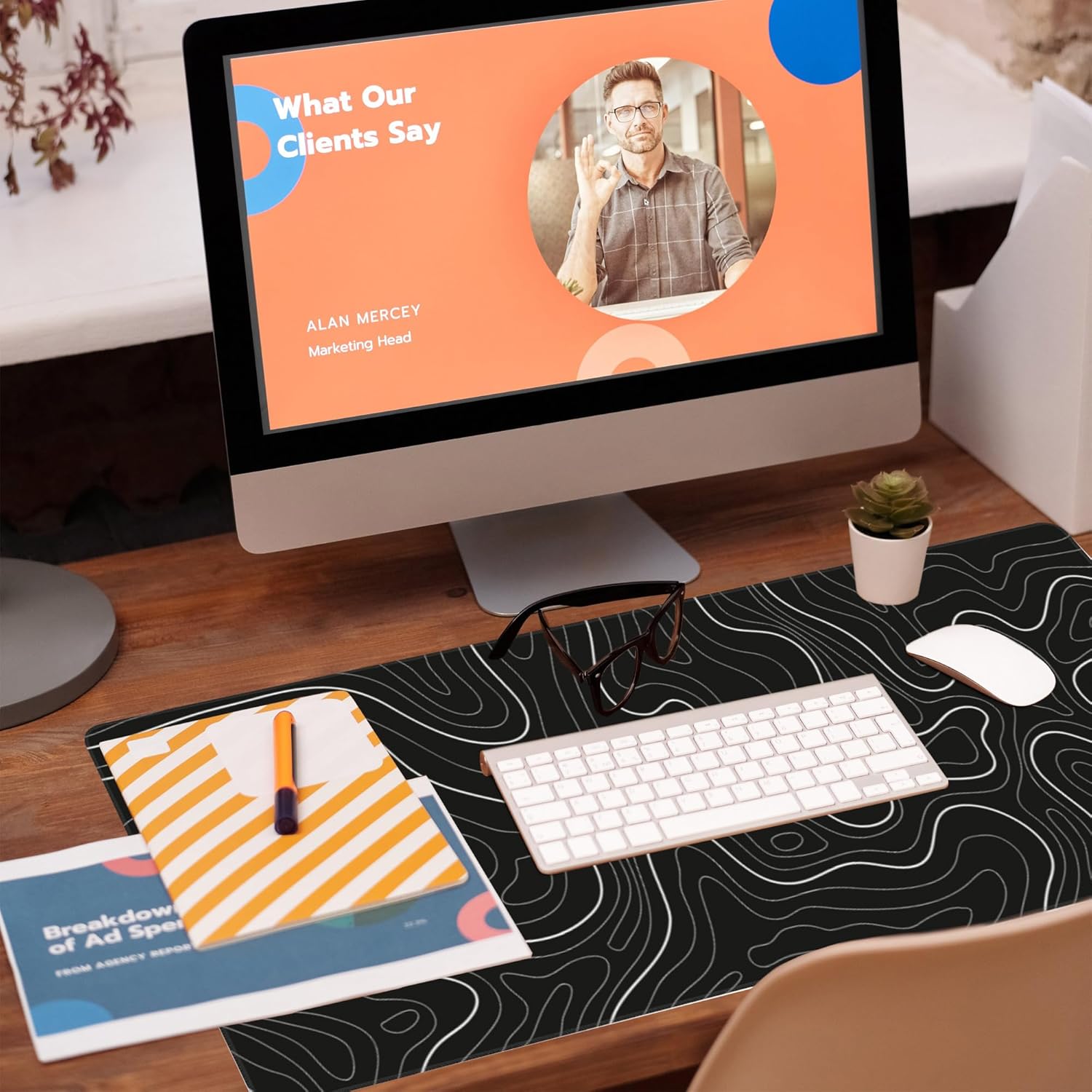 Desk Mat,Black Topographic Contour Map Desk Pad,Topographic Contour Large Gaming Mouse Pad for Desk,Extended Big Computer Keyboard Mouse Pad with Non-Slip Base and Stitched Edge,35.4"x15.7"