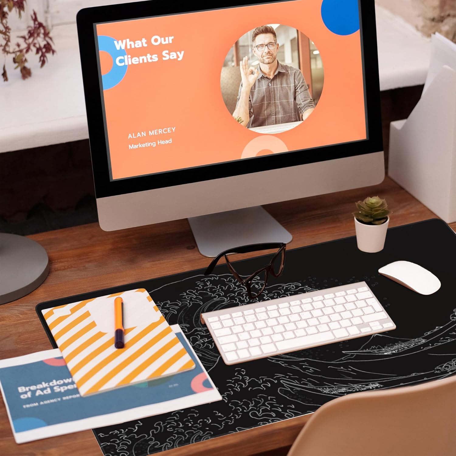 Desk Mat, Black Japanese Sea Wave Desk Pad, Extended Big Computer Keyboard Mouse Pad with Non-Slip Base and Stitched Edge, 35.4"x15.7"
