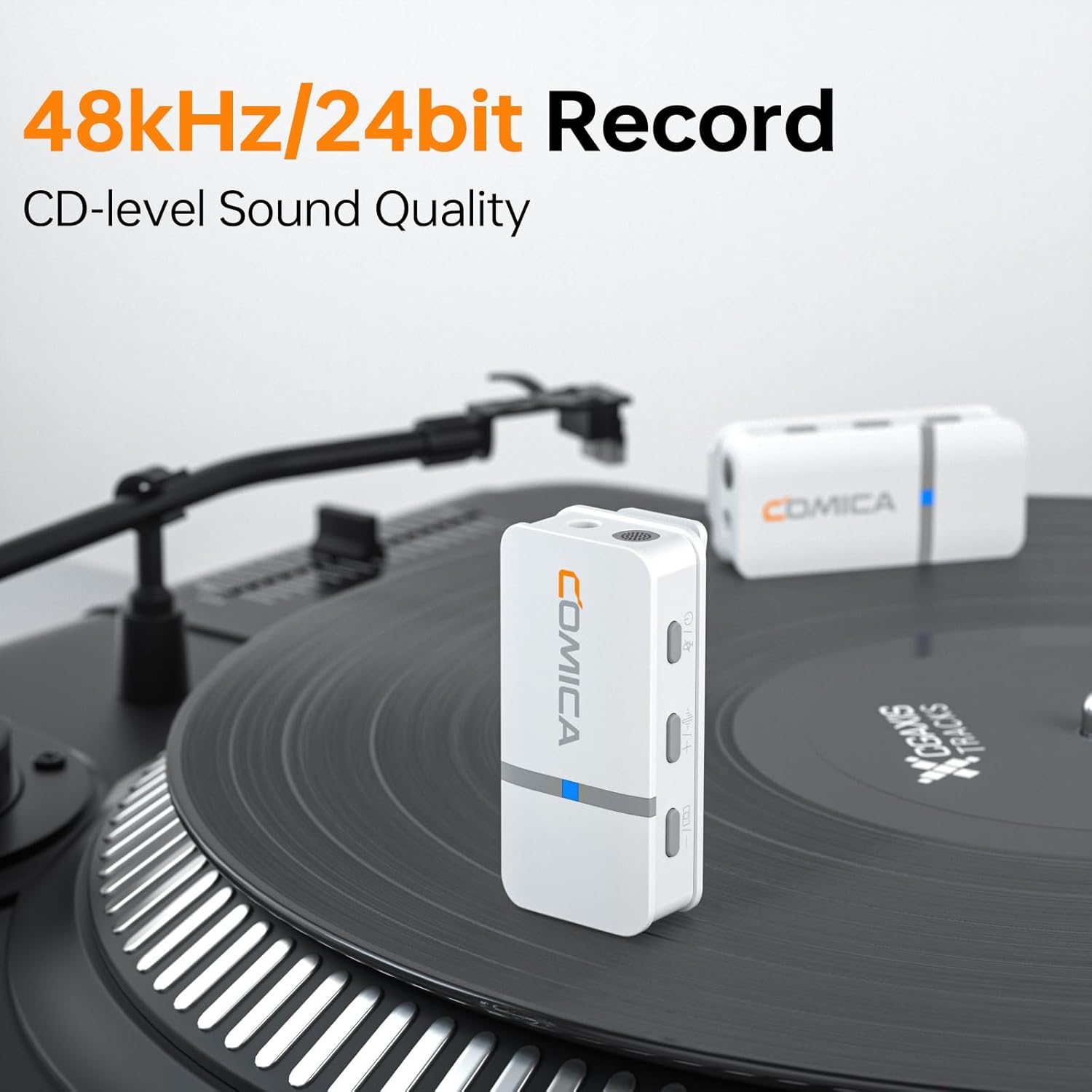 - 48kHz/24bit Audio Capture: Immerse your audience in crystal-clear sound with the Comica Vimo Q wireless microphones' 48kHz/24bit recording capability, ensuring every detail is captured in natural, high-fidelity audio. (Exclusive to USB-C Digital Output Mode)