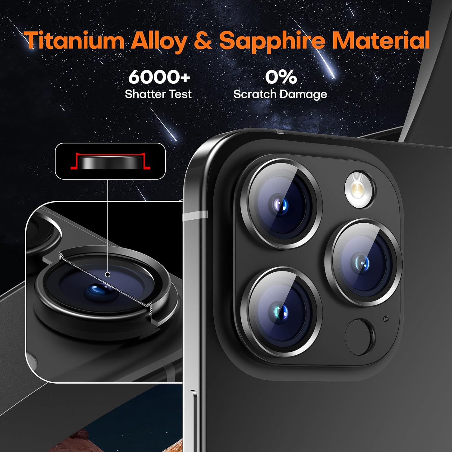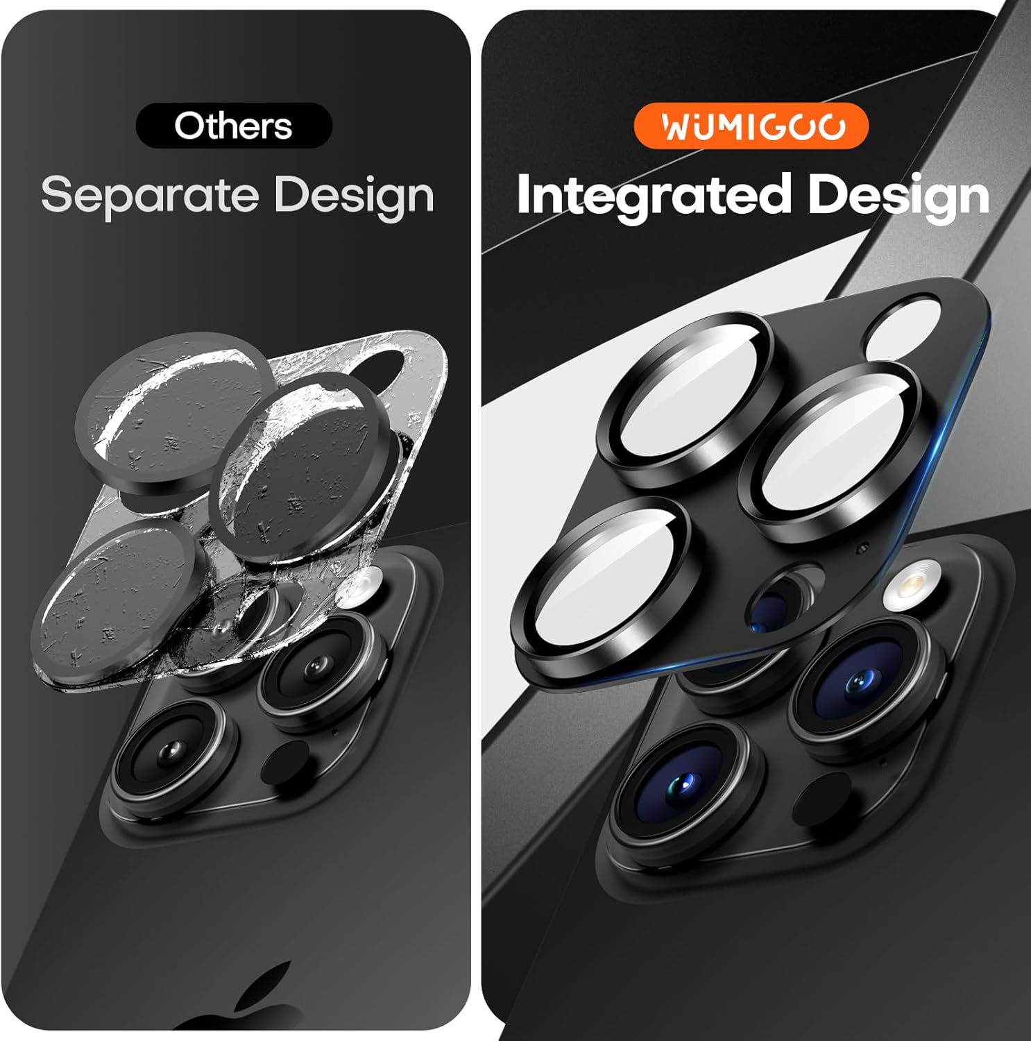 - [Upgraded Designed] Wumigoo camera lens protector for iPhone 16 Pro Max/16 Pro/15 Pro Max/15 Pro/14 Pro Max/14 Pro compared to other brands, features an integrated design that offers enhanced protection and never falls off. Titanium alloy with 99% transmittance sapphire glass combination defends every angle of impact and crack issues. Electroplating AF oiled technology shows telephoto and macro shots exhibit their original colors.