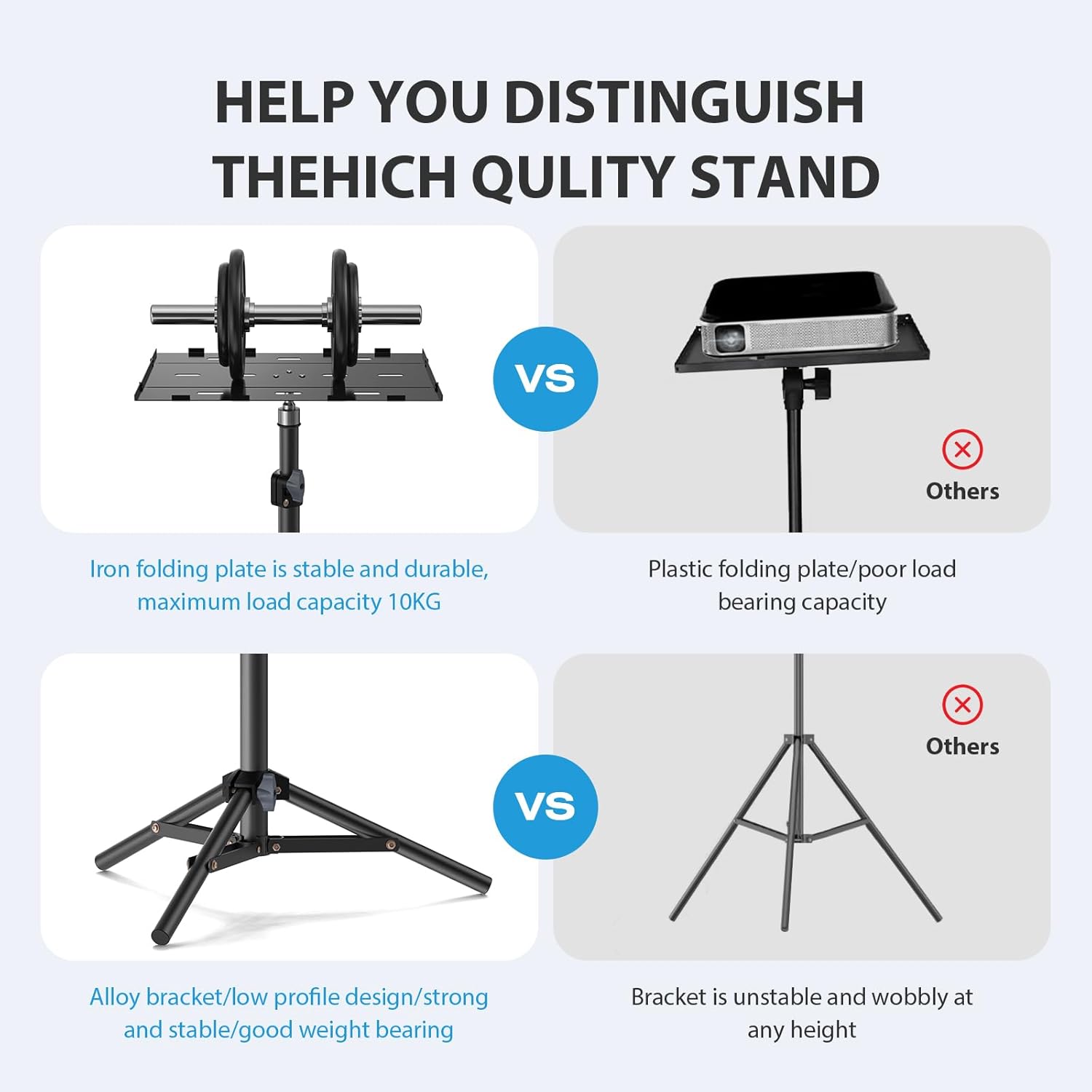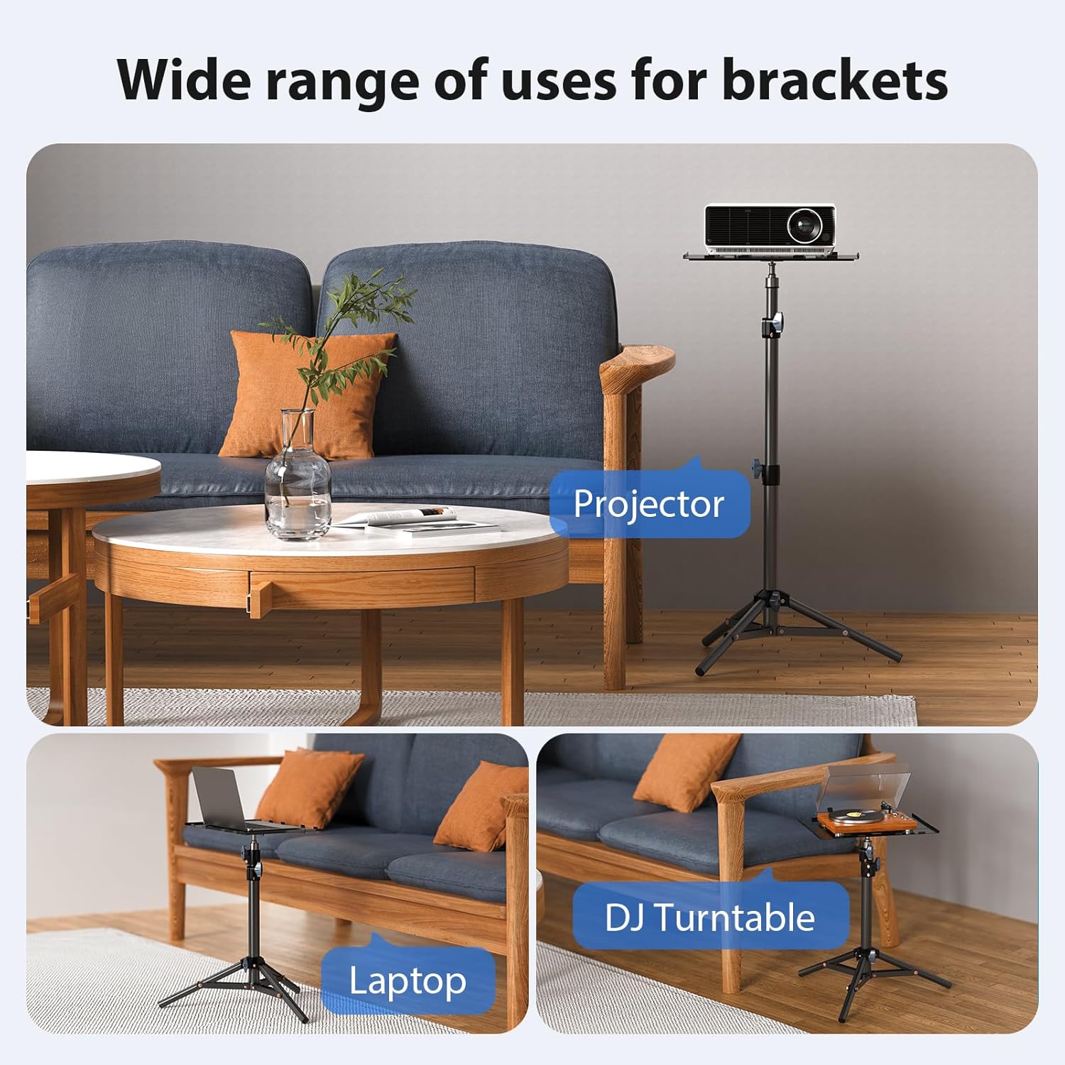 - -Quick installation - 10s: The projector tripod mount has an all-in-one design that is compact and easy to install in less than 30 seconds. The stand features a retractable design with a storage bag for easy setup, and its collapsible tray and tripod are easy to store and carry.The enlarged top tray (13.4 “ x 9.68 ”) supports a wide range of device sizes such as projectors, laptops, music players and DJs