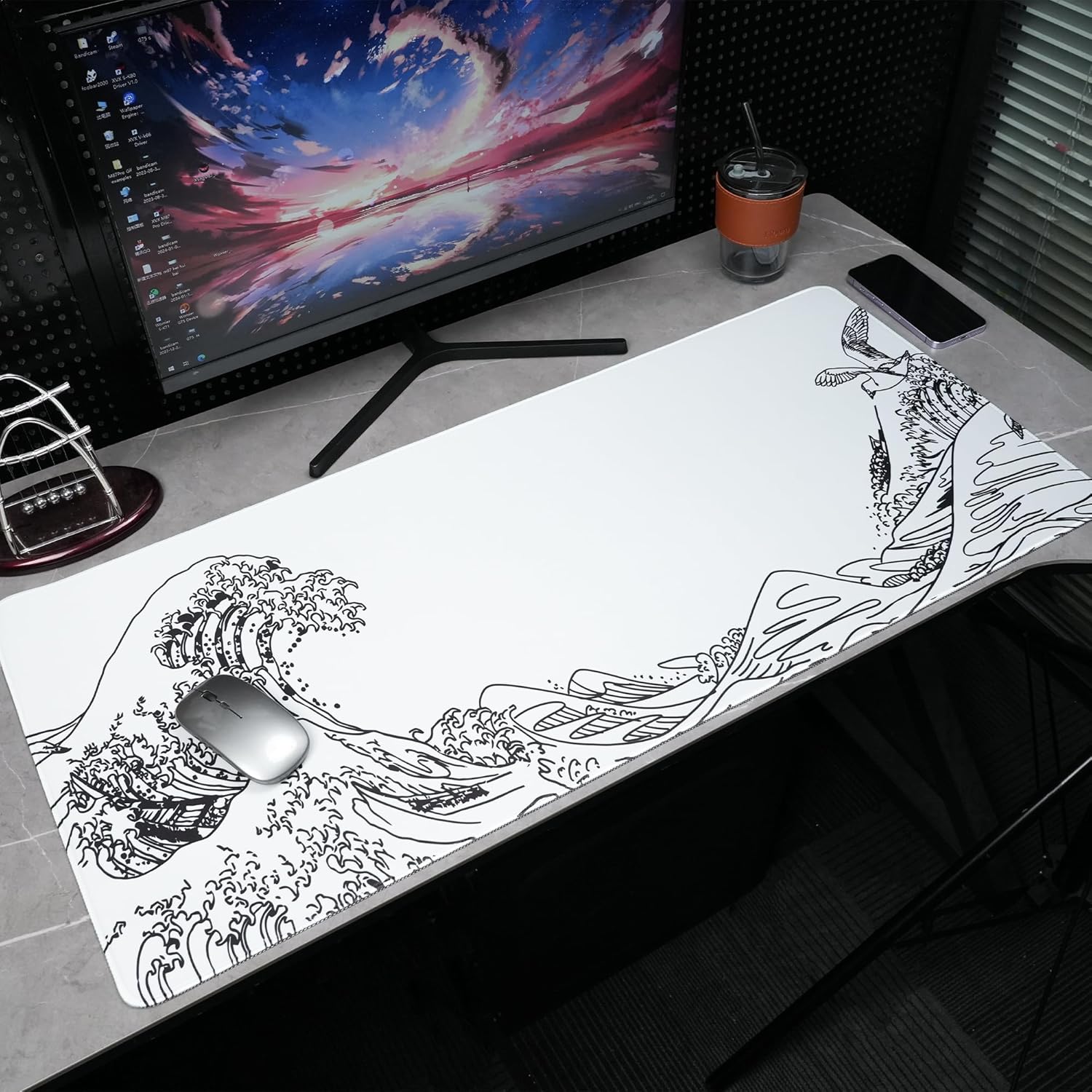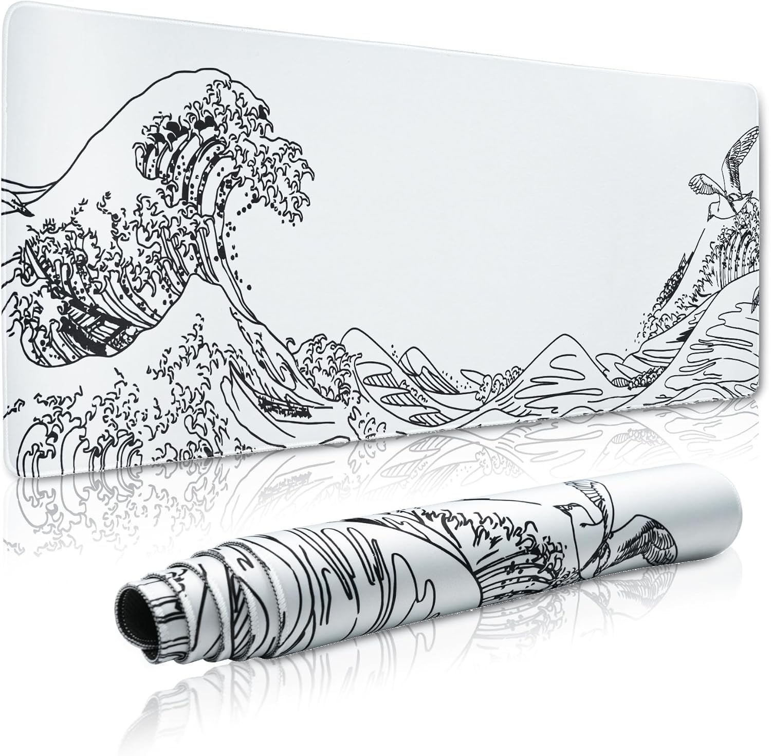 Large Gaming Mouse Pad for Desk,Kanagawa XXL Mouse Pad 35.4x15.7 Inch,Waterproof Desk Pad,Non-Slip Rubber Base Mice Pad,Keyboard Pad Computer Mat,White Mouse pad