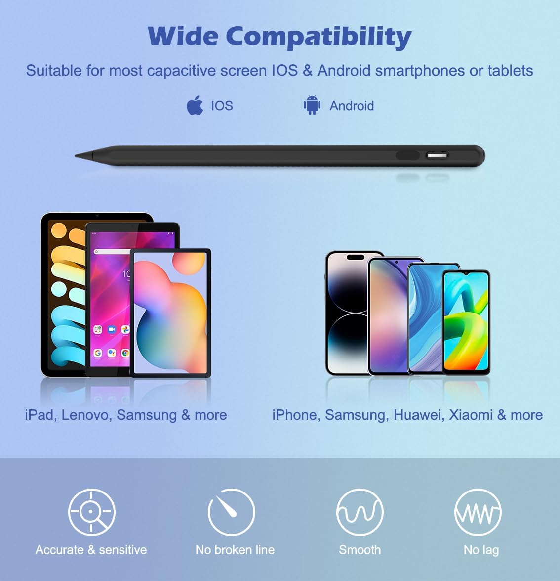 - 【Wide Compatibility】: This universal touch screen stylus pen is compatible with most touch screen devices including iPad, iPhone, Samsung, Huawei, Xiaomi, Lenovo, and other capacitive screen IOS & Android smartphones or tablets. Note: Does not support Amazon Fire, Kindle, Microsoft, Chromebook or EMR screens.