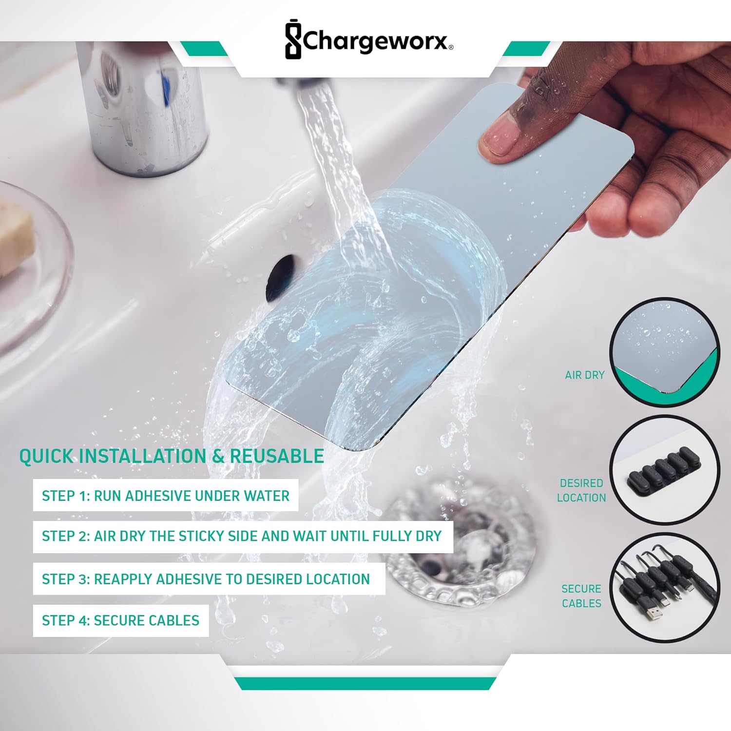 - REUSABLE WIRE ORGANIZER: The durable adhesive base can be easily repositioned, so you won’t have to stress about where to place it. Simply peel, stick, and attach your magnetic cord organizer where you like. No additional tools are necessary. The adhesive withstands up to 10 clean reapplications, letting you change layouts as you update and replace devices.