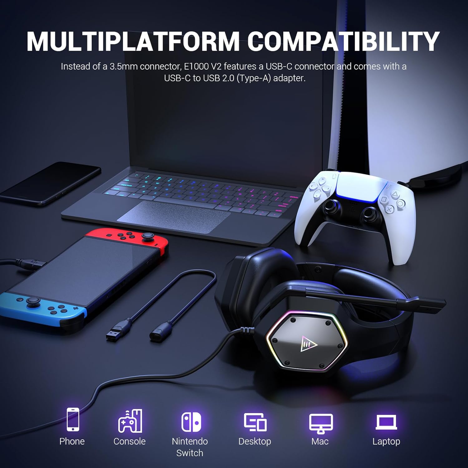 - [Noise Cancelling Microphone] E1000 V2 noise cancelling headphones reduces distracting background noise and ensures loud and crystal-clear communication with its adjustable high-sensitive microphone. The headset's omnidirectional noise reduction technology allows you to enjoy high-quality sound during gaming or in-game chats.