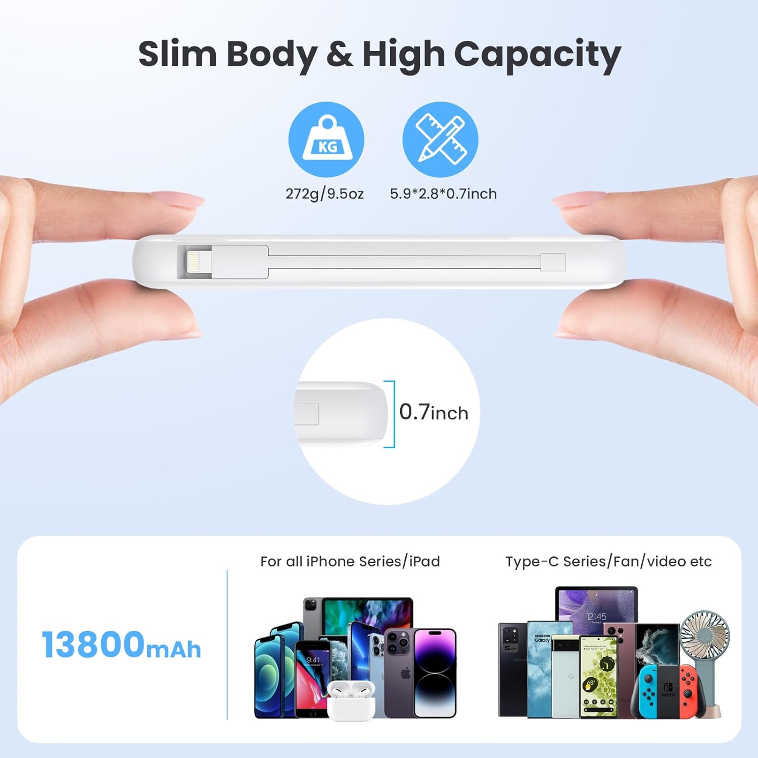 Portable Charger with Built-in Cables and AC Wall Plug 13800mAh,LCD Display Slim PD Fast USB C Power Bank,4 Outputs Travel Essentials Battery Pack Compatible with iPhone,Samsung,All Smart Phones-White