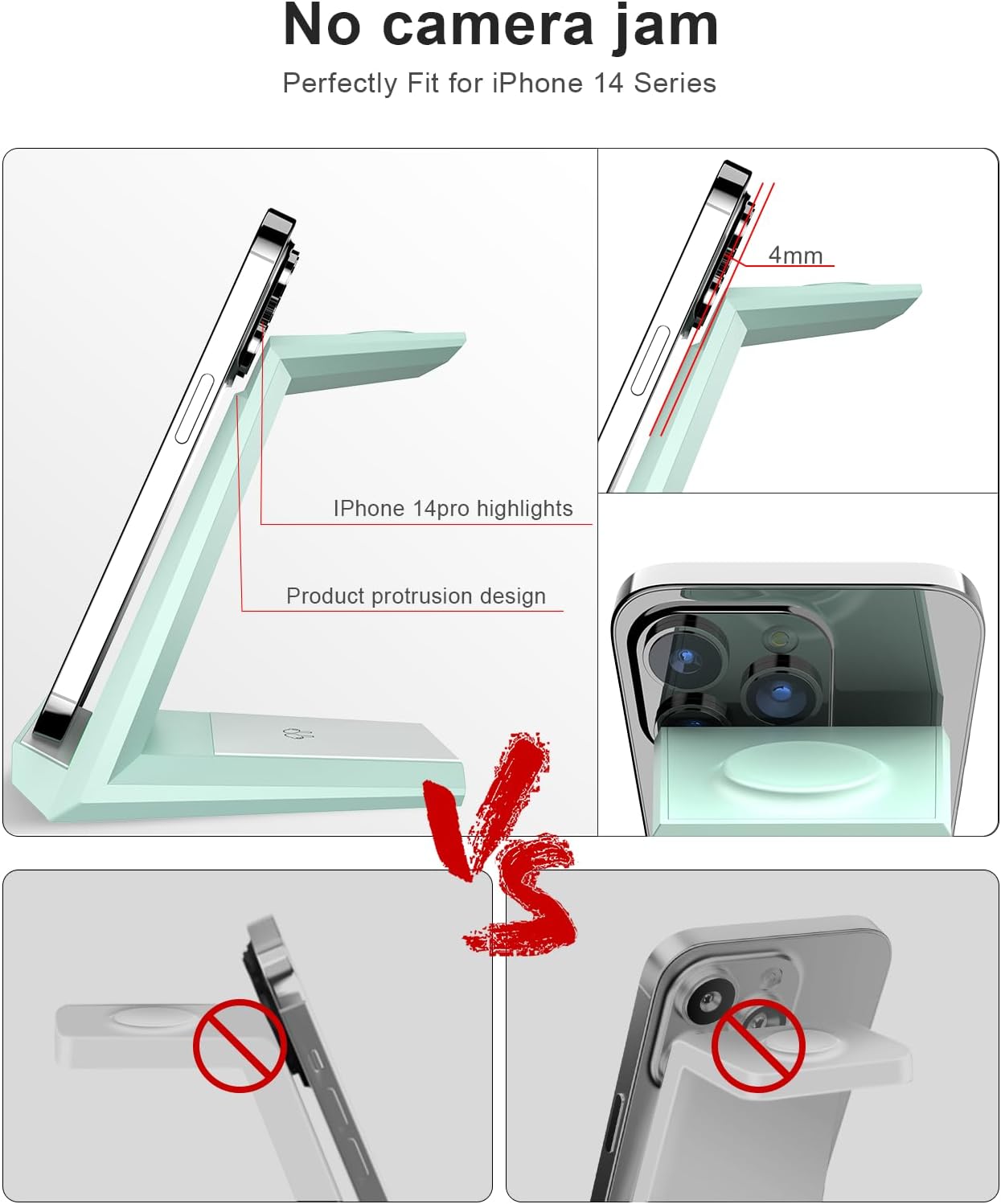 - [Vertically & Horizontally Charging]: Built-in 2 high-purity copper charging coils offering no blind spot charging, which identifies your phones sensitively. The 3 in 1 wireless charger supports charging phones in vertical or horizontal with a tilt angle design for better watching videos or viewing messages while charging