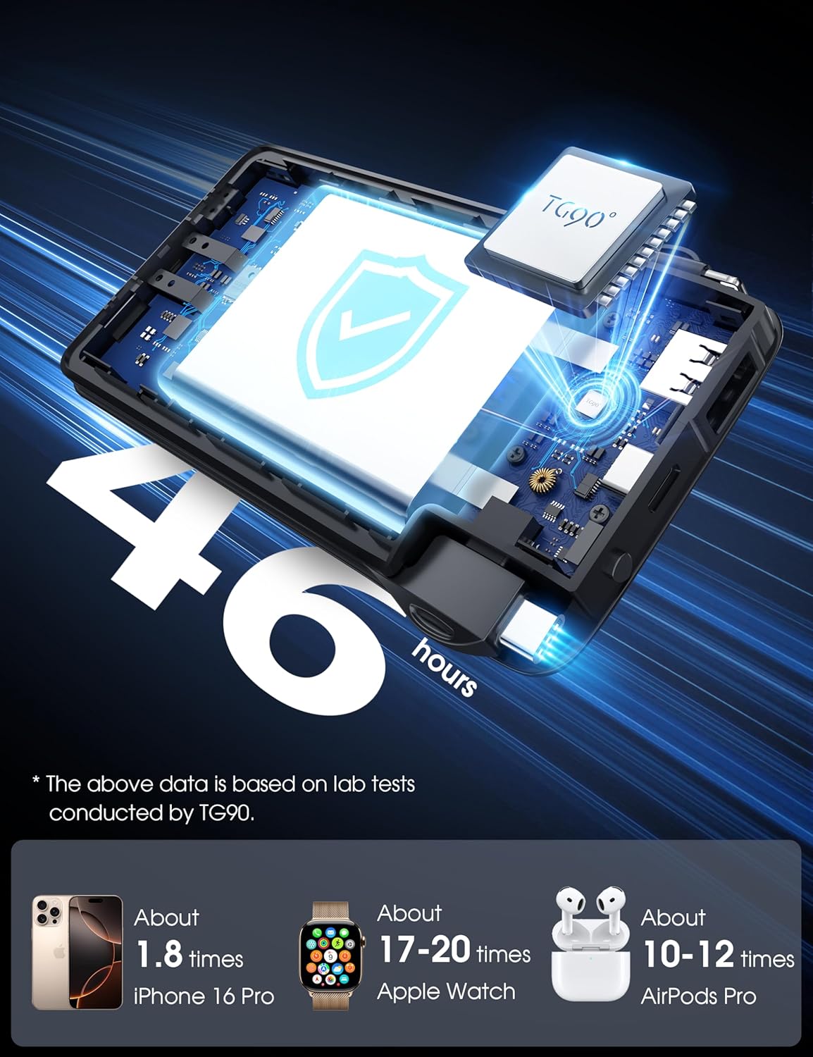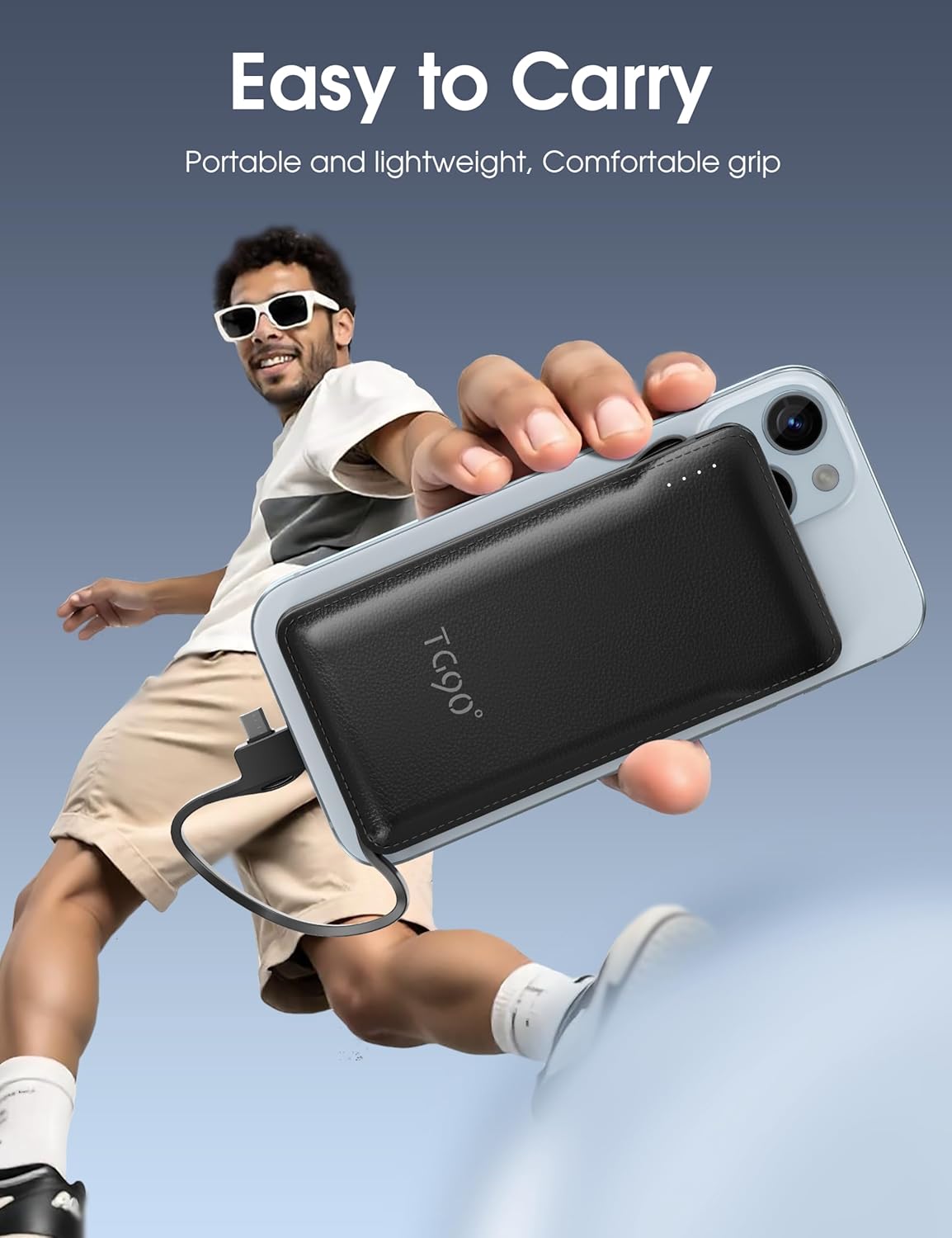 TG90° 10000mAh Portable Charger with Built-in AC Wall Plug and Cables, Ultra Slim USB C Power Bank External Battery Pack Compatible with iPhone and Android Phones