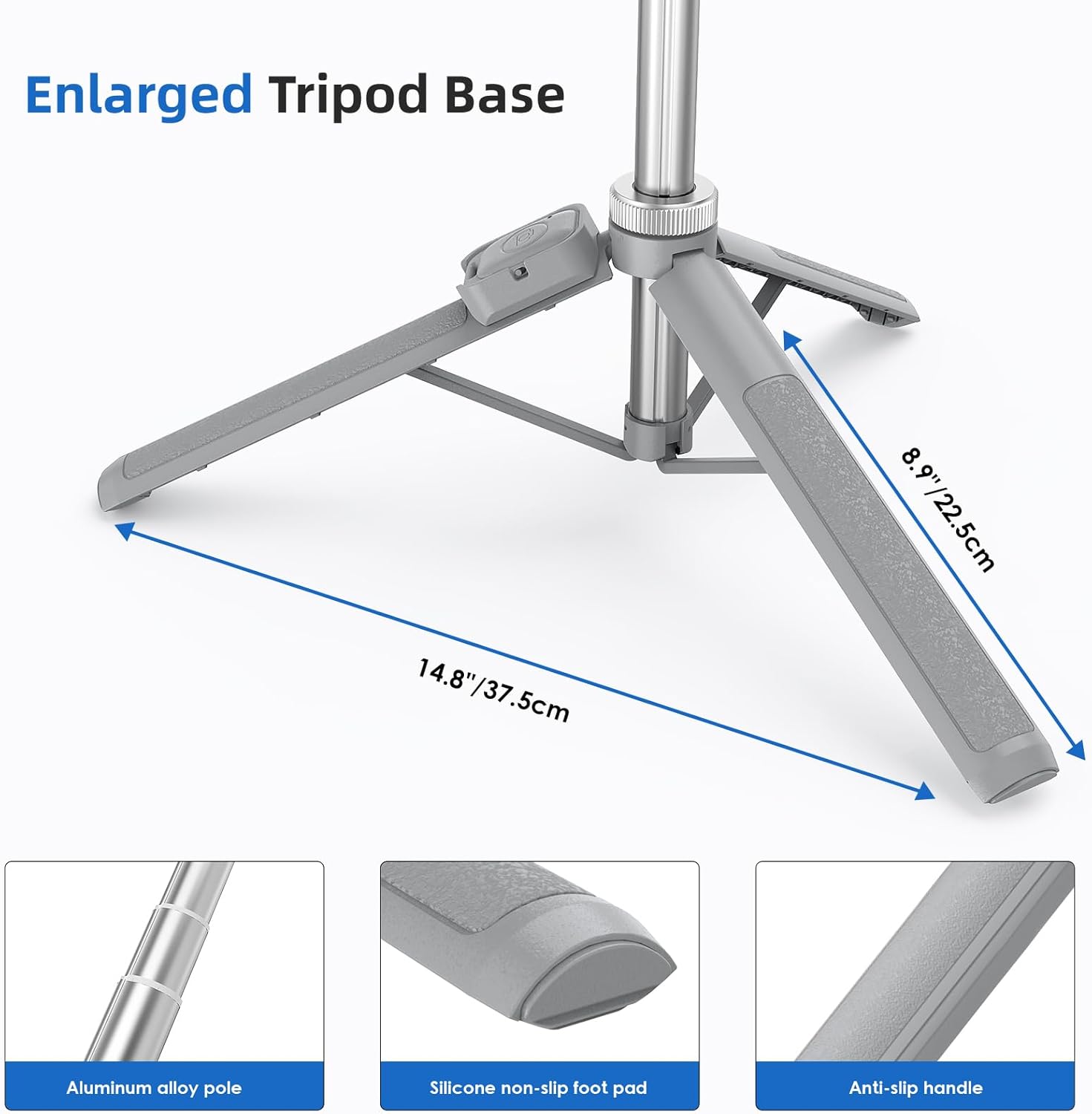 - 【Enhanced Tripod Base】The newly upgraded tripod base is equipped with silicone anti-slip foot pads, which are more stable and less prone to shaking when unfolded. And our phone tripod has an adjustable metal ring that helps you lock the tripod quickly. It is perfect for selfies, family photos, video logs, YouTube, live streaming, FaceTime, and Instagram.