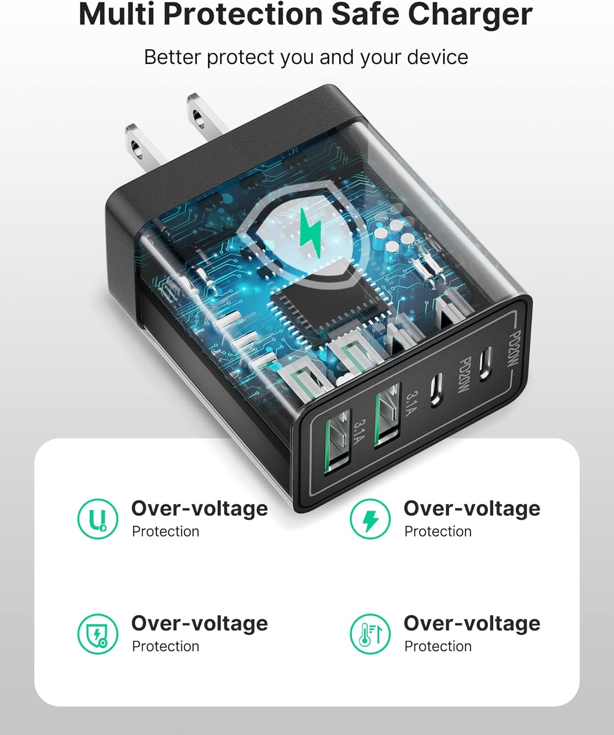 - 【Complete Safety & Reliability】:Certified RoHS,CE & FCC,protect devices from overheated and over-currents,overcharging,and short circuits,charging will be automatically stopped when the battery is full. The USB C Wall Plug is made of ABS + PC fireproof material,ensuring that your digital device always charges safely