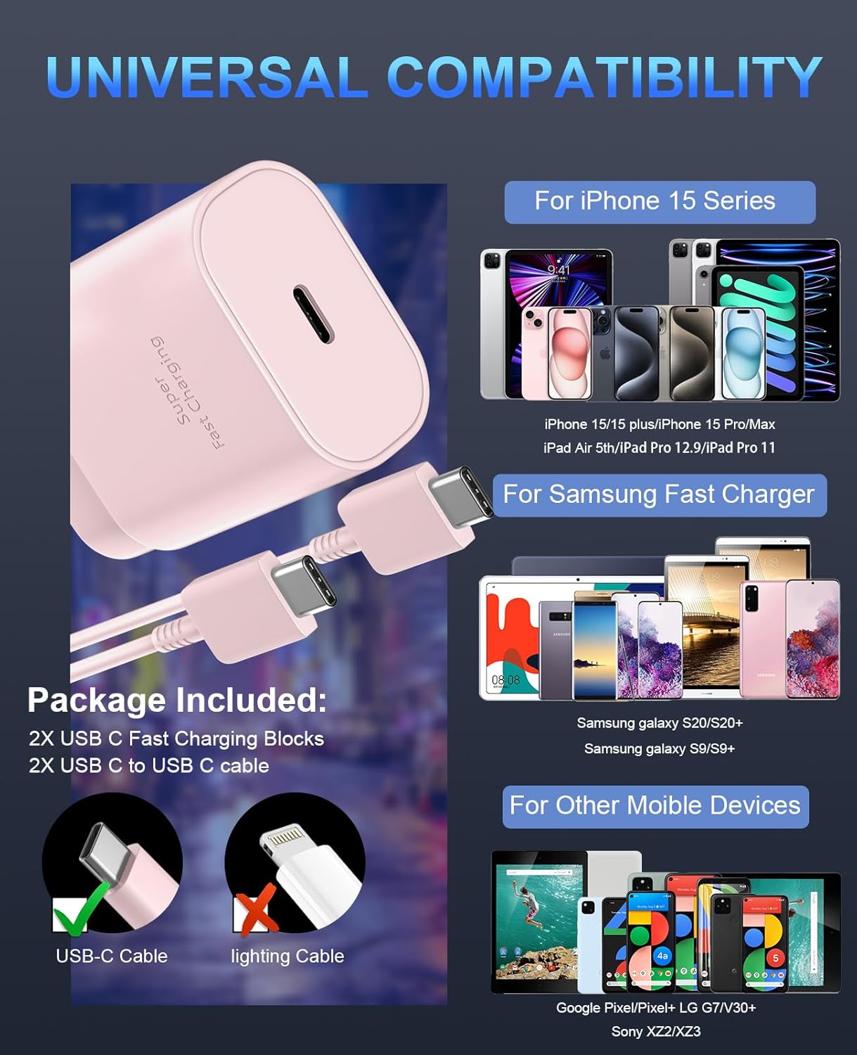 - Included Components : 2*30W USB-C Smart Power Phone 16 15 Charger with Fast Charging + 2*10FT USB-C to USB-C Charging Cable 2*30W USB-C Smart Power Phone 16 15 Charger with Fast Charging + 2*10FT USB-C to USB-C Charging Cable