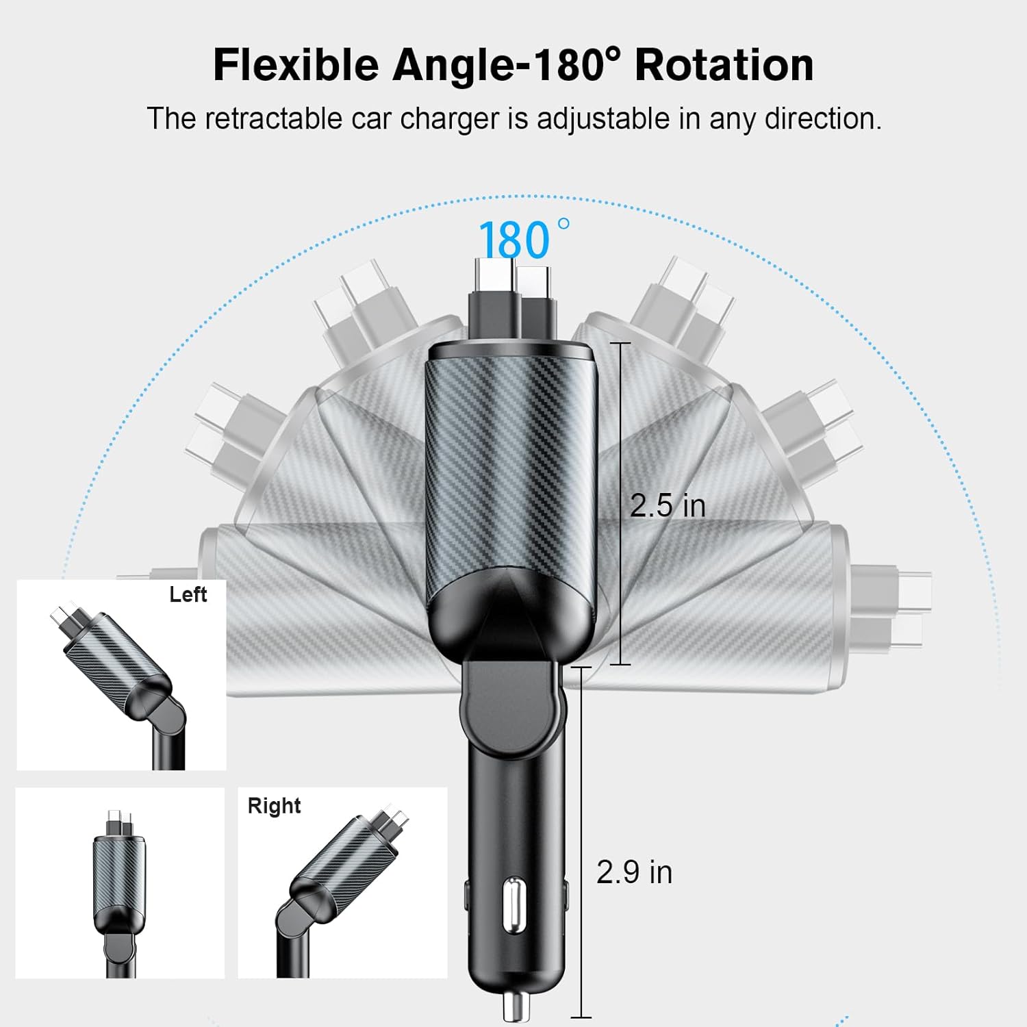 - 【Works with Most Vehicles】 This car charger with retractable cord fits into various vehicle models, from compact cars to SUVs. The retractable car phone charger rotates 180° for easy charging at any angle and fits into most 12/24V car sockets. Its strong bottom clasp keeps it secure, even on rough roads.