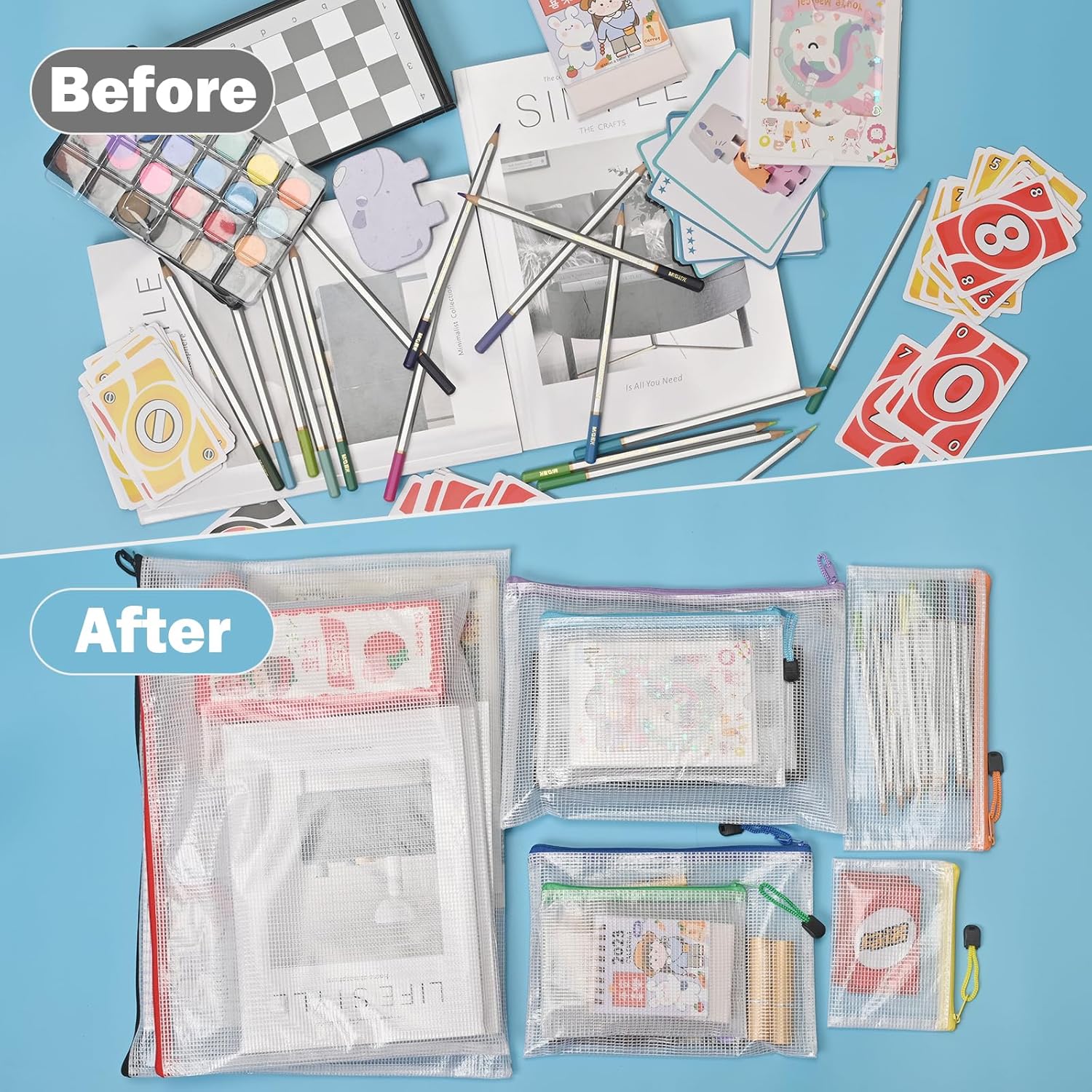 - Reusable Zipper Bags are 9 Sizes Options,You Can Organized Many Things with These Zipper Pouches. From Games, Puzzles, Snacks,Craft Supplies, Toys, Board and Card Games, Cosmetics Travel Accessories and Baking Supplies,Everything will be Organized and Has Its Place.
