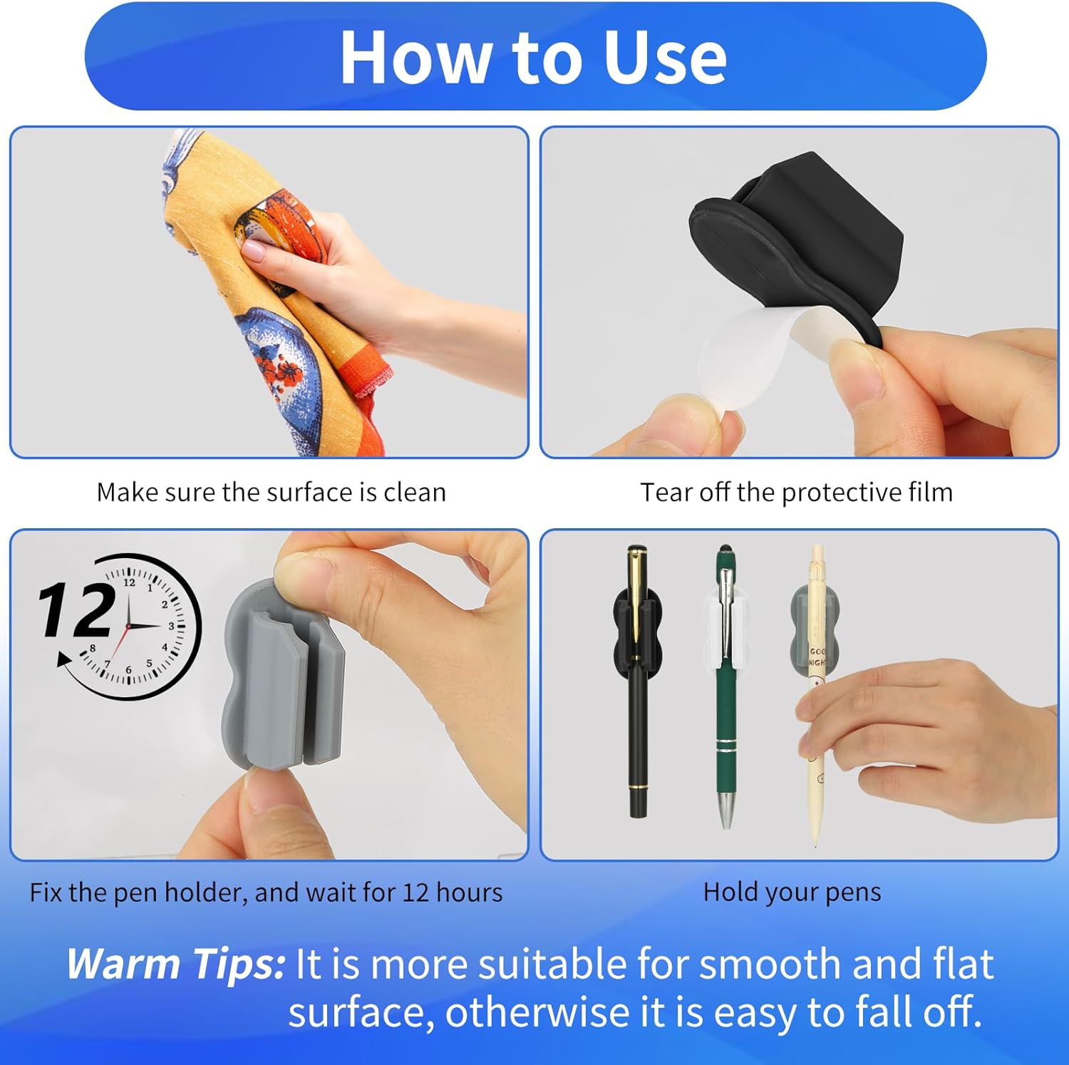 - ăSpace Saving & No More Searching For A PenăWe offer 12pcs adhesive pen holders to keep everything organized. Adding these pen holders & pencil holders to the areas where we regularly use pens throughout the house, office, and classrooms, etc. They make pens, pencils, and markers available without cluttering our space. No more lost pens, No more pens rolling off desks
