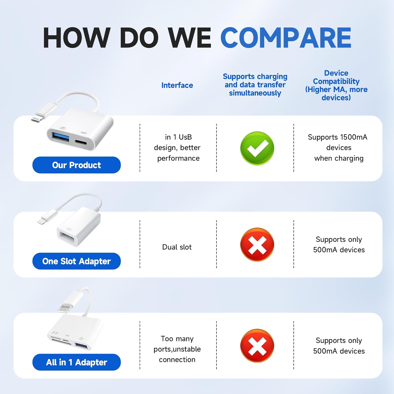 - 【Charge Your iPhone and iPad】 This USB adapter for iPhone adds a charging port for iPhone/iPad, charging, and viewing photos or videos can be operated at the same time. Don't worry about the power shortage of your phone anymore. More importantly, this USB-to-iPhone adapter can also allow you to share battery power with your friends and solve your friends' urgent needs.