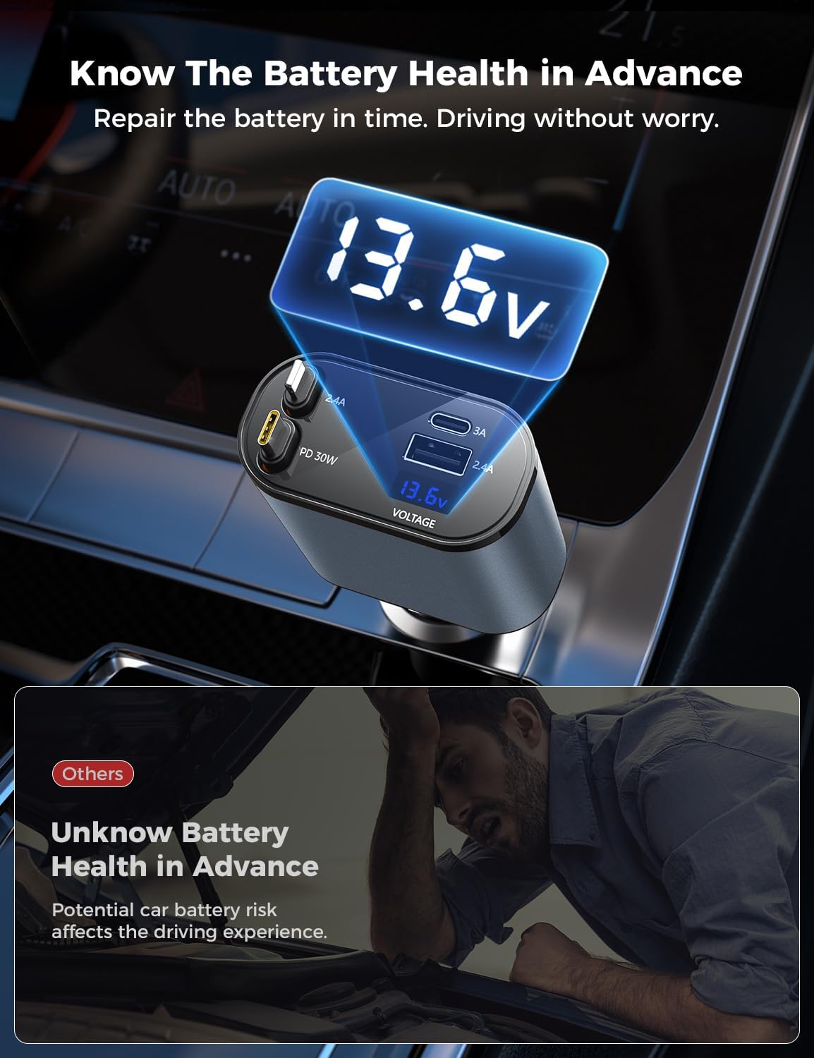 - Voltage Display for Battery Health Monitoring: Our Car Charger with cord is equipped with a voltage display feature, allowing you to monitor the health of your car battery at all times. Stay informed and ensure optimal performance for your vehicle.
