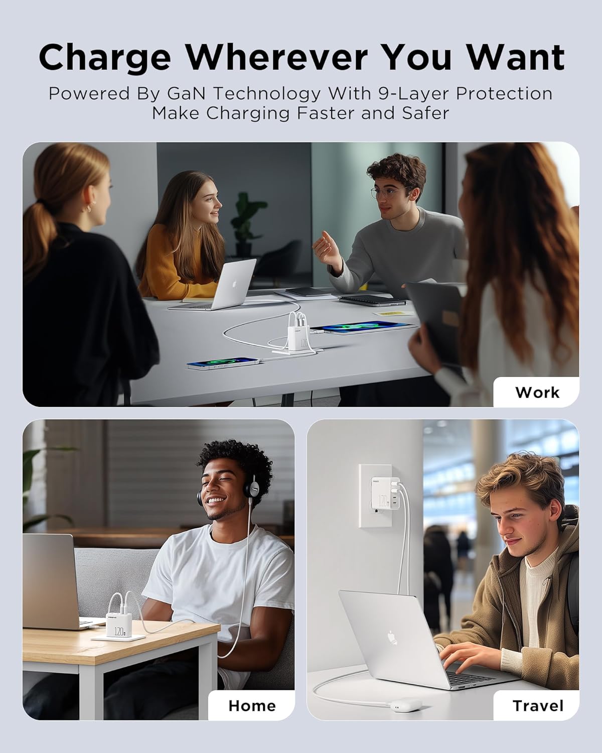 - [4-Port USB Charger]: PISEN 120W USB-C charger with two USB-C ports and two USB-A port supports a total power of up to 120W. Single USB-C port connect a device to charge at up to 100W. Allows users to charge phone, tablet and headset simultaneously to minimize waiting time. It is also a great space saver instead of taking up 4-socket outlets.