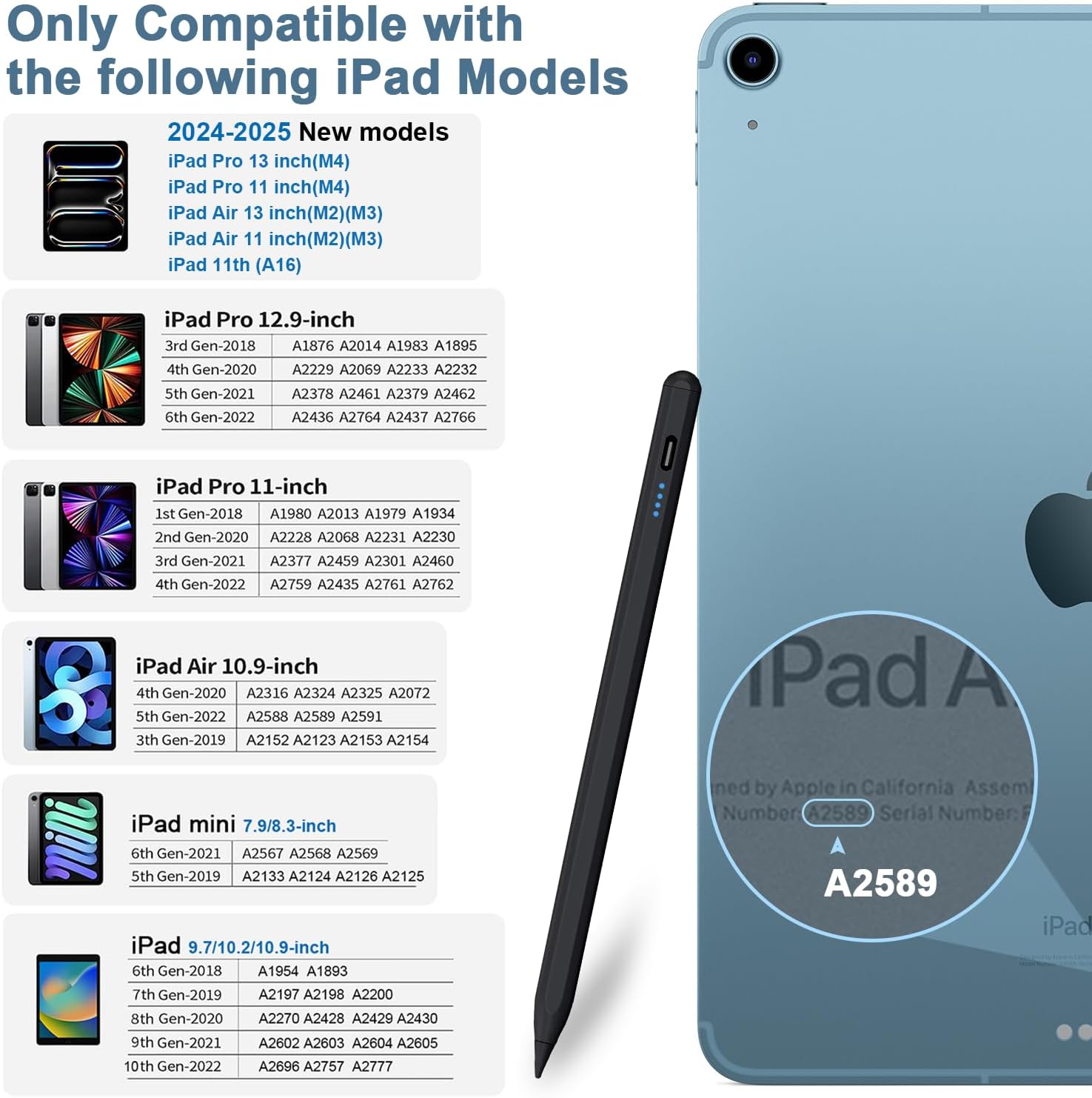 Stylus Pen for iPad 9th&10th - Type-c Charging Pencil for ipad Palm Rejection Active Pen Compatible with (2018-2025) Apple iPad 6/7/8/9/10/11(A16), Air 3/4/5/M2/M3, Mini 5/6, Pro 11"/12.9"/M4(Black)