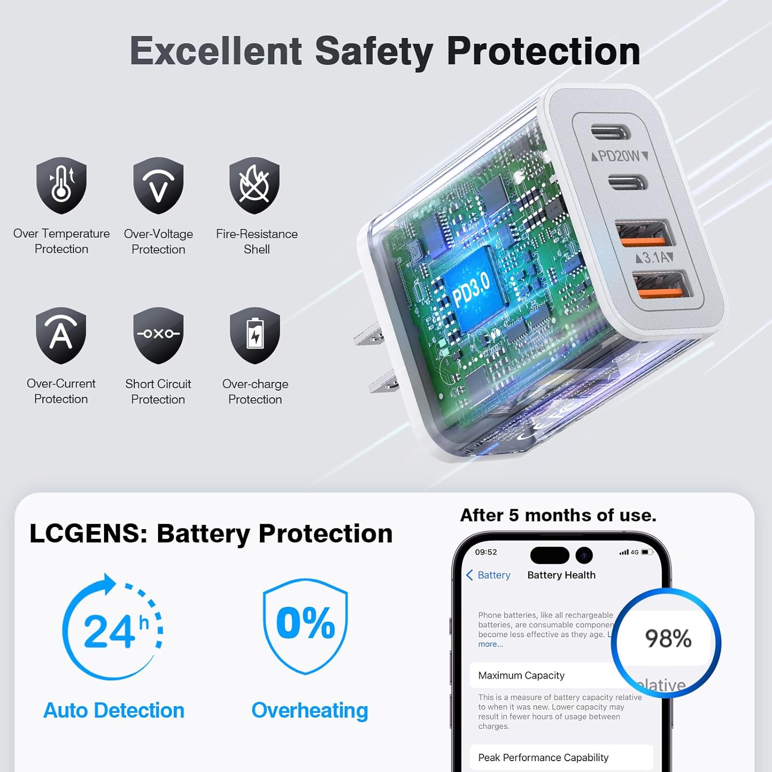 - Safe and Secure Charging Brick:Multiport charger station comes with overcharge, overcurrent, and overheating protection systems. It automatically stops charging when your devices are fully charged, maximizing device protection and safety