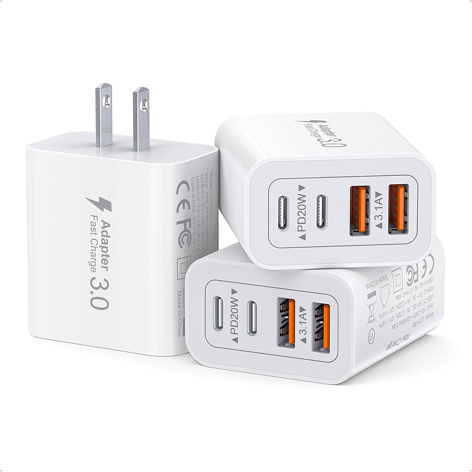- 3 Pack 40W Fast Charging Block:3P 40W wall charger features USB C Quick Charge and Power Delivery, delivering a total power of 40W. The USB-A port offers 3.1/A/V output power, while the USB-C port provides 20W charging speed. Charge four mobile devices simultaneously at high speed, saving you valuable time