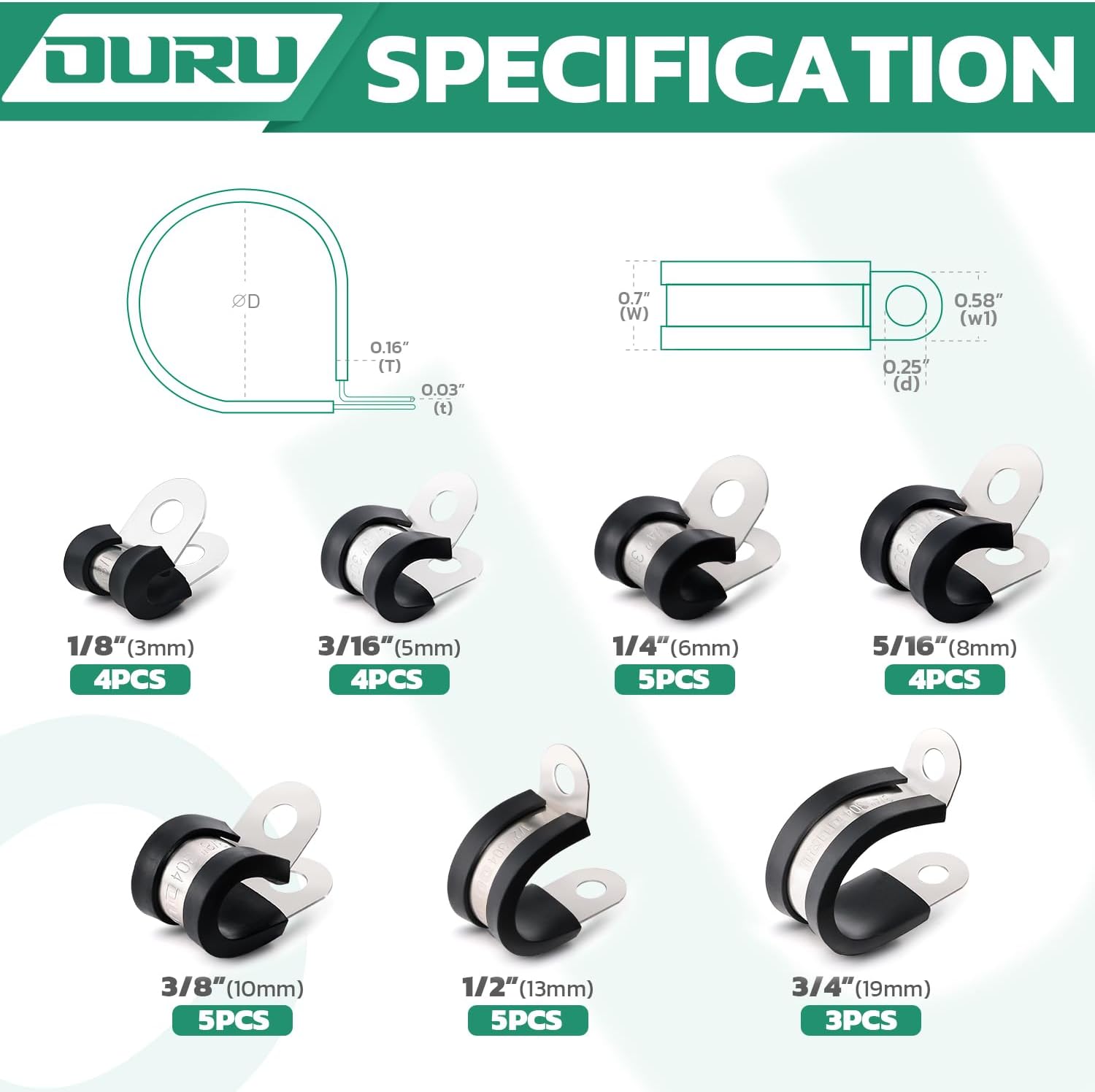 - 30PCS Cable Clamps Assortment Kit —The stainless steel cable clamps assorted box including 7 different sizes,4pcs 1/8”(3mm),4pcs 3/16"(4mm),5pcs 1/4"(5mm),4pcs 5/16”(8mm),5pcs 3/8"(10mm),5pcs 1/2"(13mm),3pcs 3/4"(19mm),various sizes are available to meet your needs