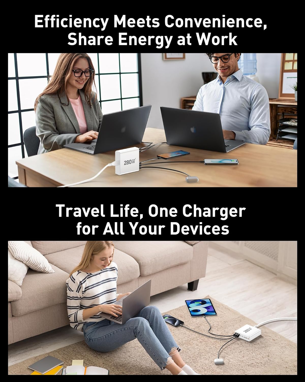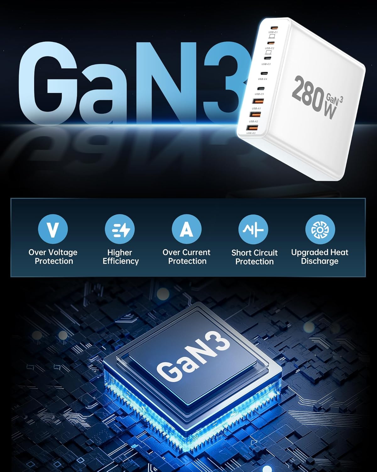 280W USB C Charger Block, 8-Port USB C Charging Station GaN III PD 65W Laptop Charger Adapter Compatible with MacBookPro/Air,DELL,iPad,Portable Charging Station for iPhone,Samsung Galaxy (White)