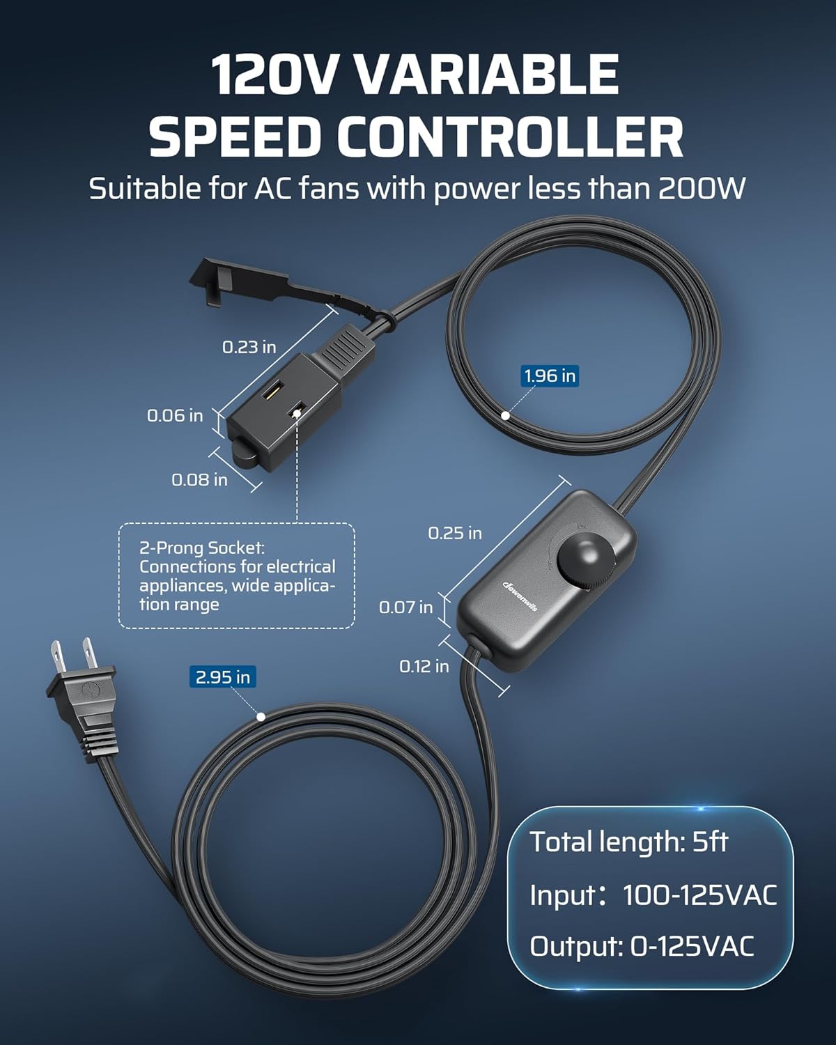 - [5FT Cord for Flexible Use] Unlike other fans, our exhaust fan 120mm comes with a 5ft speed controller cord, allowing you to adjust the fan to the optimal ventilation spot without being limited by cord length; perfectly adaptable to various home layouts