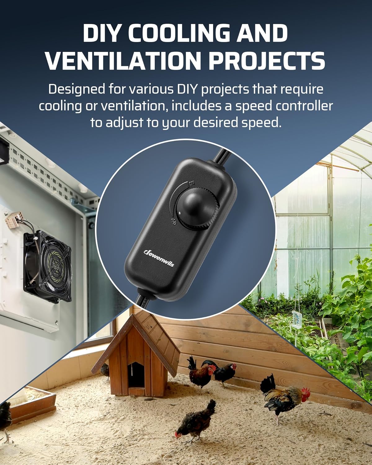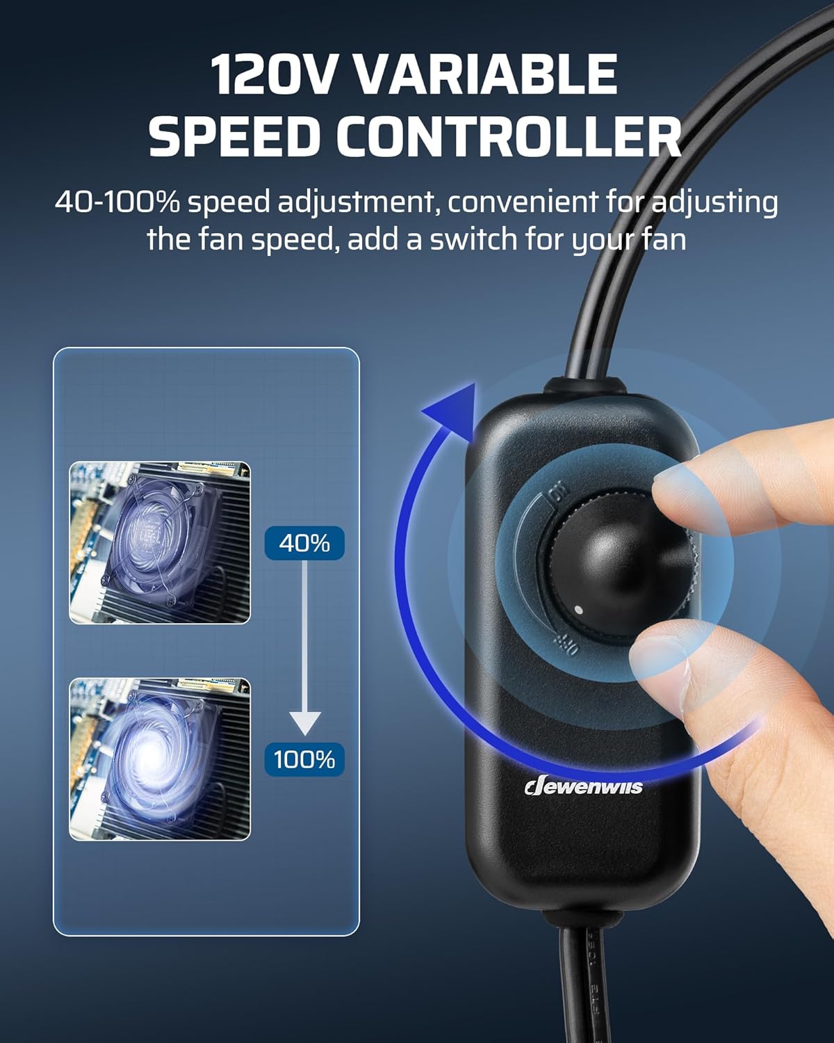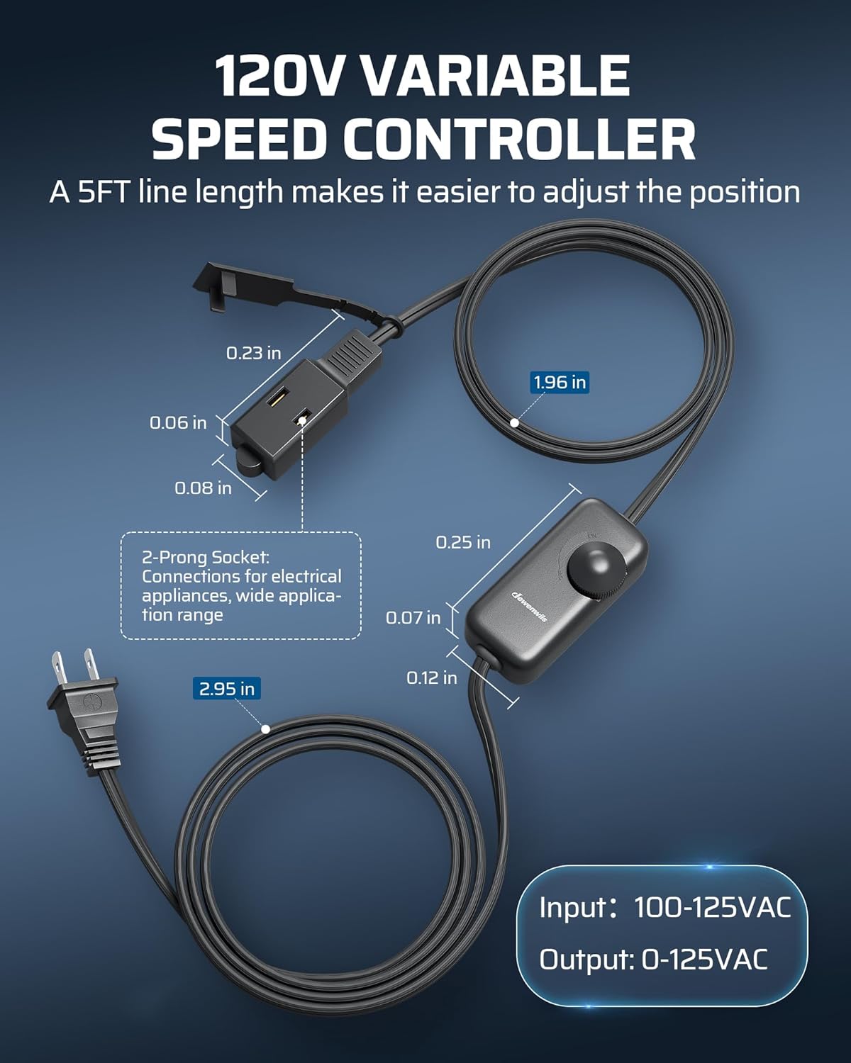 - [Flexible 5FT Cord] 5ft cord for more flexible to use, the fan controller is ideal for various DIY projects that require cooling or ventilation; and equipped with a speed controller to turn the appliances on/off and adjust the speed according to your needs