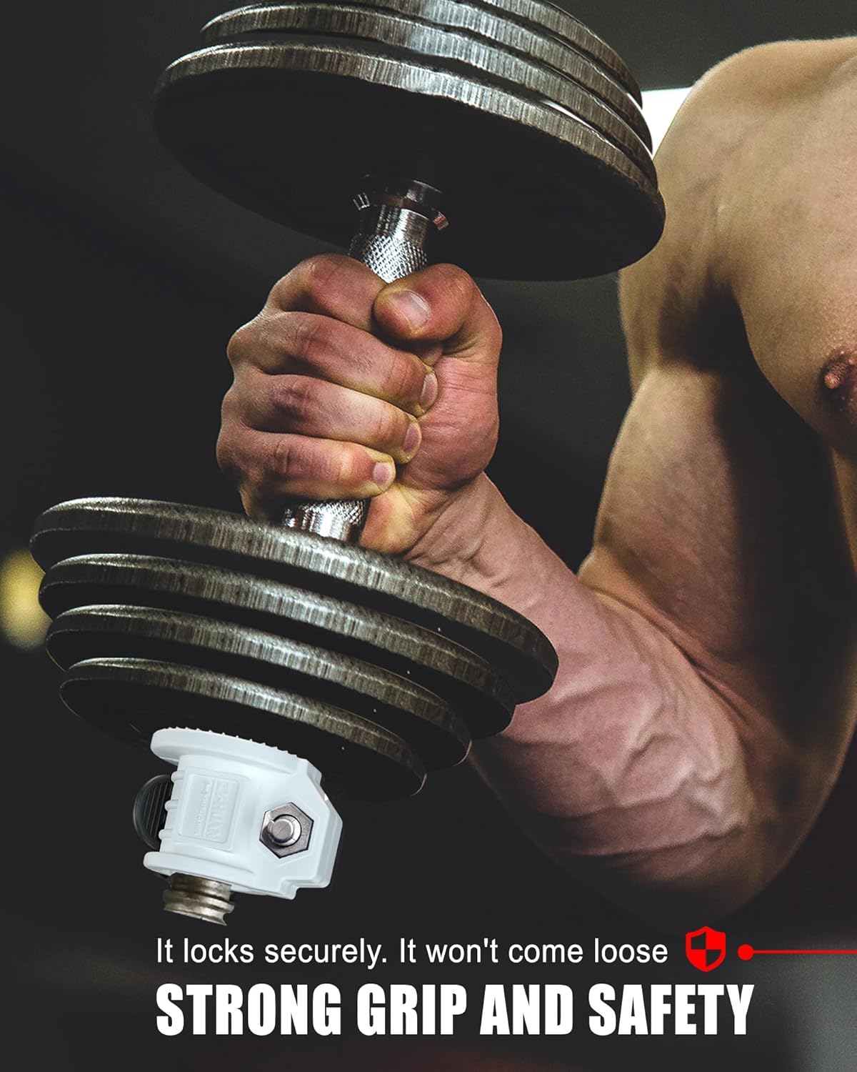 - ✔STRONG GRIP:Weight bar clips are specially designed for weightlifting and designed to provide an extra secure grip.Use these weight clips to hold your weights in place(Weight: 400+lbs)so they don't go rolling around while you're lifting. The proof of strength, even if you hold the dumbbell vertically(Weight: 60lbs), you can keep the weight! These weightlifting clips are perfect for dumbbell rows,benching, squatting etc.