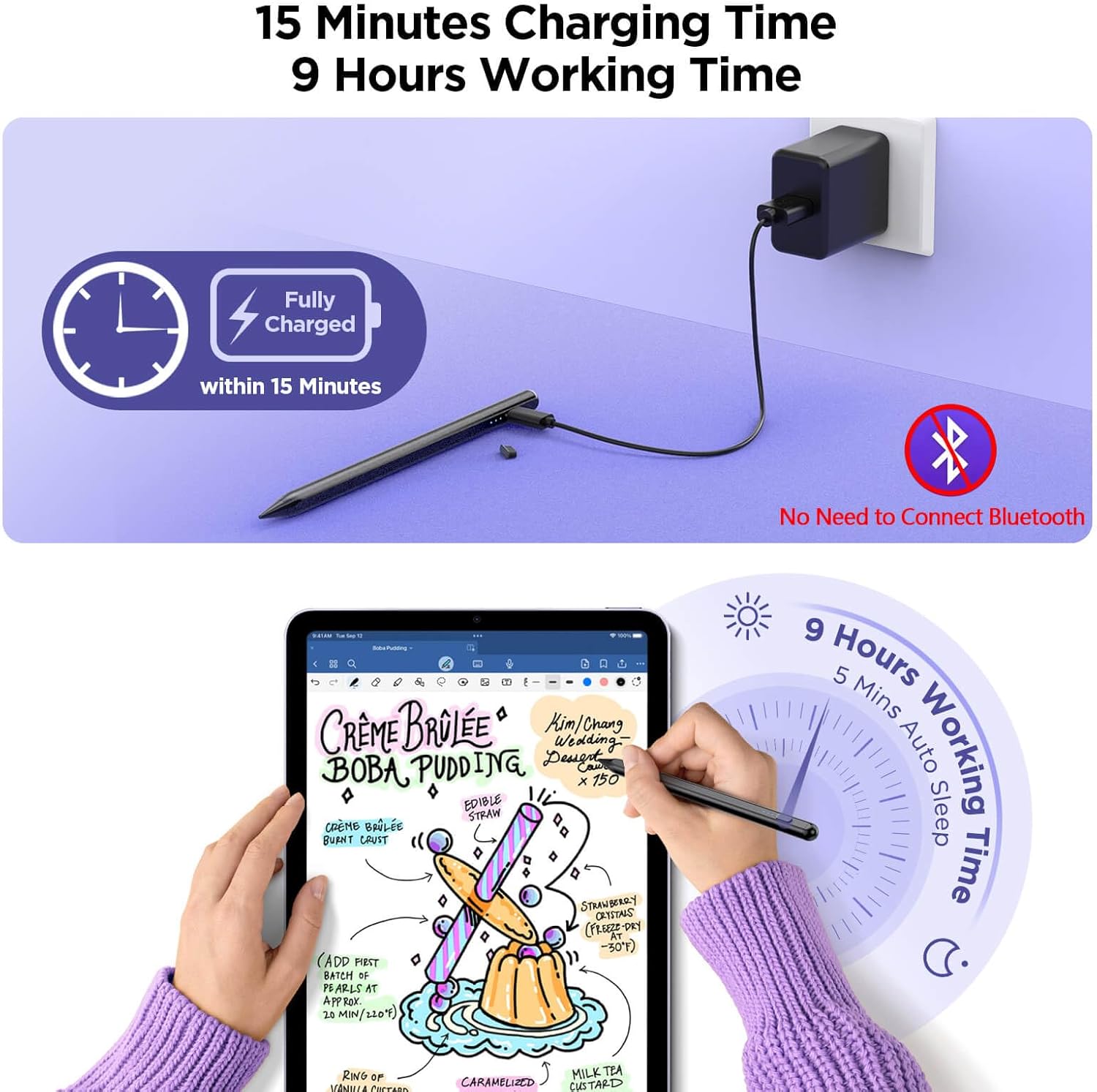 - ă15 Mins Fast Charging, 9 Hours of Useă No need to charge frequently. Experience uninterrupted creativity with our iPad pencil lightning-fast charging capabilities. 2X Faster Charging speed than others. Just 15 minutes of charging provides an impressive 9 hours of continuous usage, long lasting battery life.This ensures that your creative process is not interrupted. You can use it all day long.