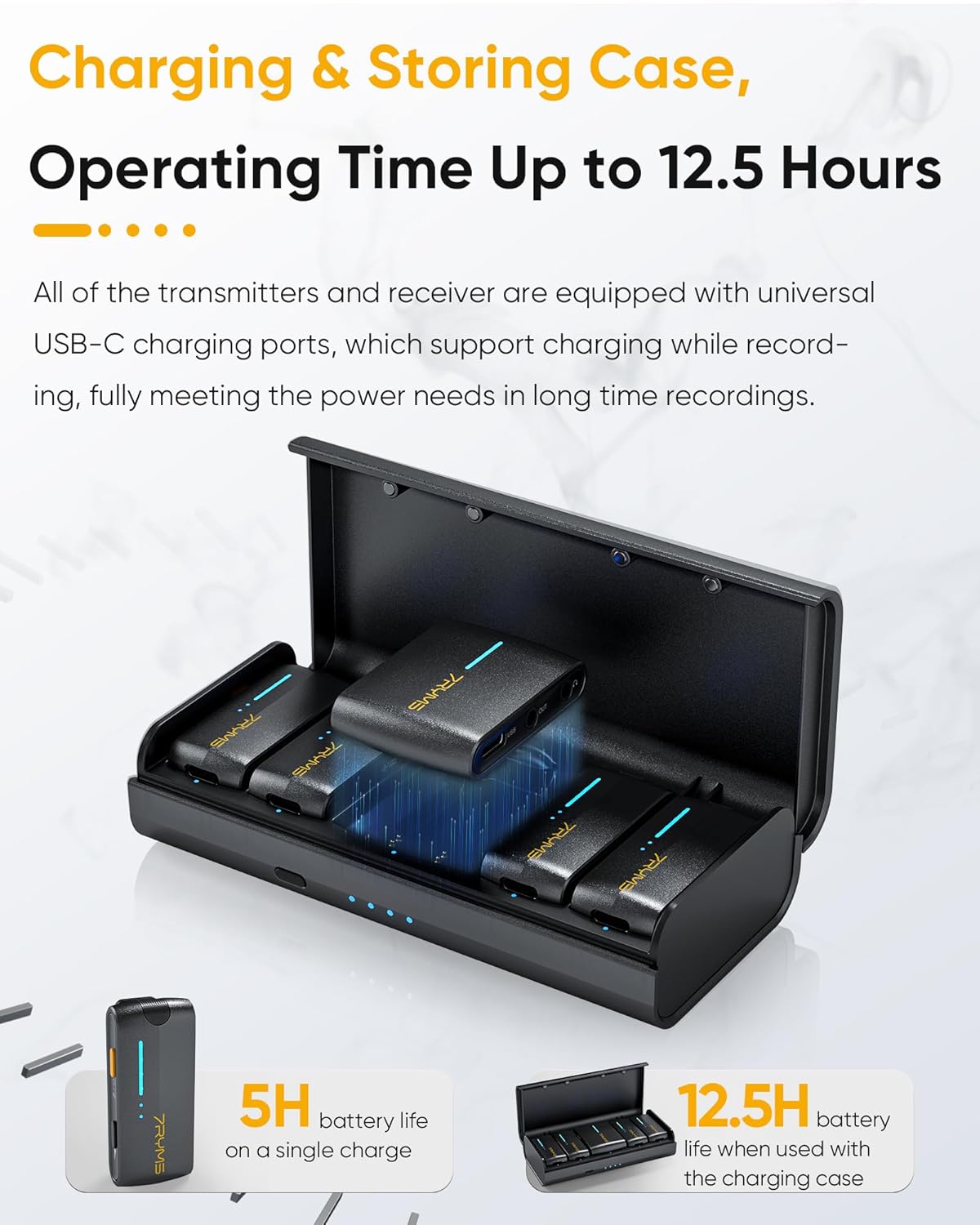 - ăCharging & Storing Case, Operating Time Up to 12.5 HoursăThe DW40 has a multi-functional storage case both for storing and charging. When used with the charging case, the total battery life can reach 12.5 hours. The universal USB-C charging ports on both the transmitters and receiver allow for seamless charging while recording, ensuring uninterrupted power during long recording sessions. Saying goodbye to battery anxiety. It also support one-click pairing in the case, making pairing more convenient.