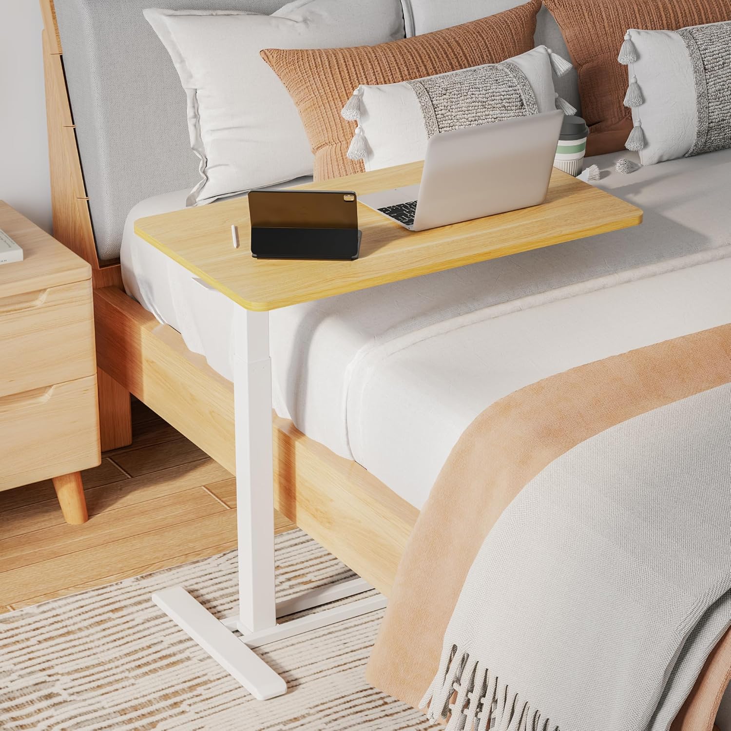 SANODESK Medical Adjustable Overbed Bedside Table with Hidden Casters, Pneumatic Mobile Laptop Computer Standing Desk Cart with Tray, Hospital and Home Use(31.5" W x 17.7" D, Maple)