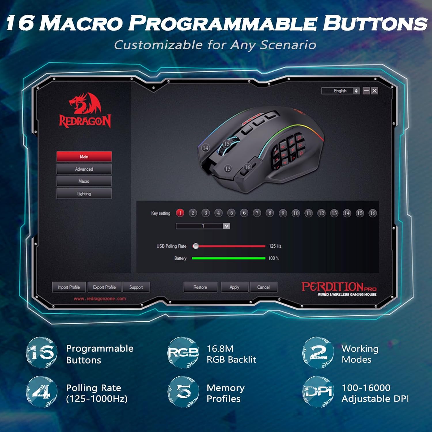 - 【Real Customizable】You can remap the 16 buttons through macro editing to meet your usage habits under different conditions. Equipped with 5 Memory Profiles to save your settings, and 2 working modes that can be switched with one click. Redragon MMO Mouse is customizable for Any Scenario, always be one step ahead of others.